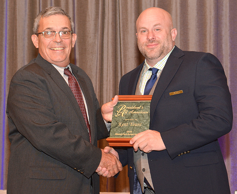 Kent Yount, Farm Bureau agency sales manager in Atchison and Nodaway counties, was presented the 2016 President’s All American award by the Missouri Farm Bureau Insurance Companies.