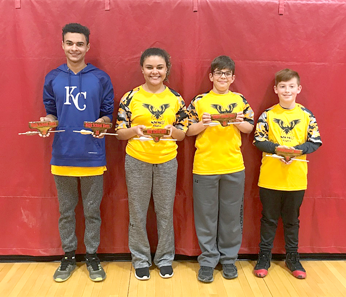 Northwest Missouri Eagles Archery Team competes: Placing in the North Andrew archery competition December 15, 2018, are local archers, from left to right, Blade Wright, Britney Wright, Brett Wright, and Aiden James. Garrett Sheldon also placed, but is not pictured.
