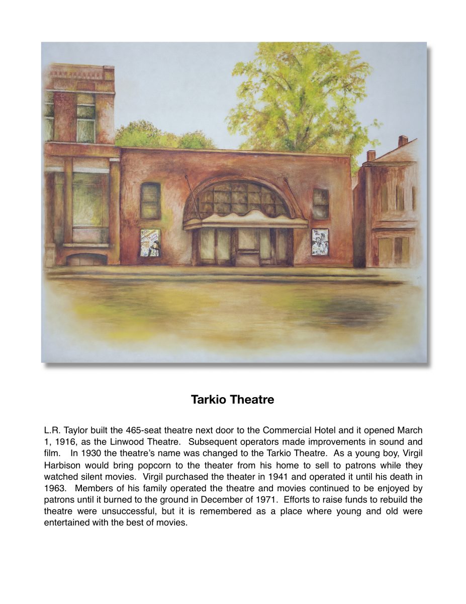L.R. Taylor built the 465-seat theatre next door to the Commercial Hotel and it opened March 1, 1916, as the Linwood Theatre. Subsequent operators made improvements in sound and film. In 1930 the theatre’s name was changed to the Tarkio Theatre. As a young boy, Virgil Harbison would bring popcorn to the theater from his home to sell to patrons while they watched silent movies. Virgil purchased the theater in 1941 and operated it until his death in 1963. Members of his family operated the theatre and movies continued to be enjoyed by patrons until it burned to the ground in December of 1971. Efforts to raise funds to rebuild the theatre were unsuccessful, but it is remembered as a place where young and old were entertained with the best of movies. This picture was painted by Edna O’Dell and is featured in a book, “Tarkio Memories – Through the Art of Edna McCoy O’Dell,” being sold by Tarkio College. To request a copy of the book, contact Donald Jagger Photography, 12016 County Road 4001, Holts Summit, MO 65043, 660-623-0859, or email flasher@me.com.