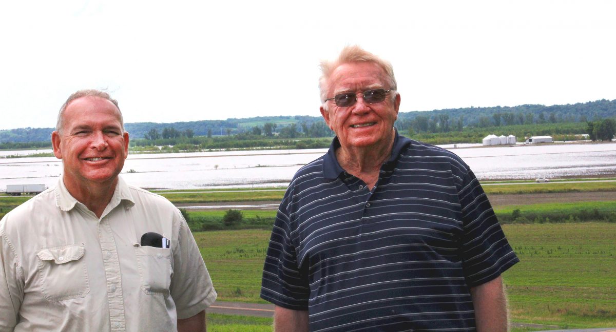 University of Missouri Extension agronomist Wayne Flanary, left, and longtime area farmer Morris Heitman, right, stand in front of flooded land that could not be planted this year. Overall, Missouri ranked fourth in the nation in prevented-planting acres in 2019. (Photo by Linda Geist)