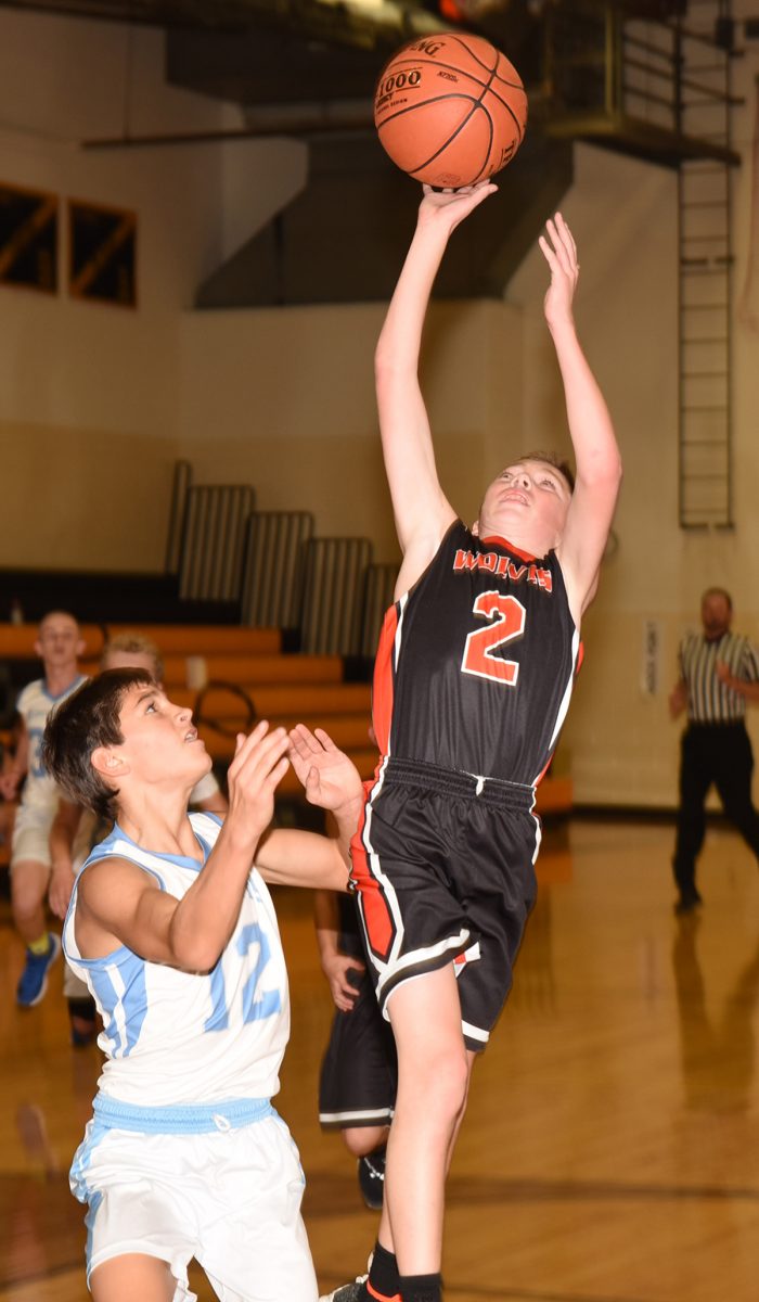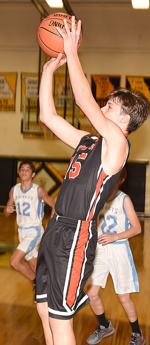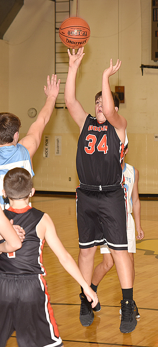 Alex Erickson puts up a shot in Wolves’ junior high basketball action in the South Holt Tournament.