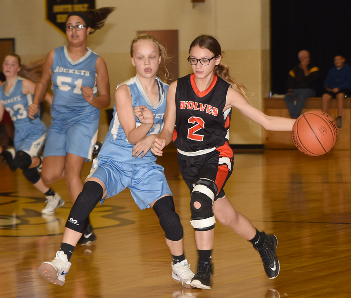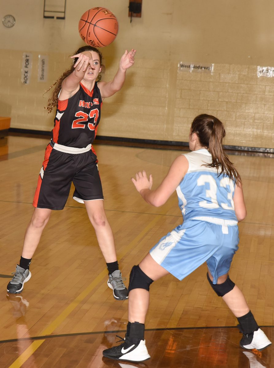 Passing the ball in Lady Wolves’ junior high basketball action in the South Holt Tournament is Claire Martin.