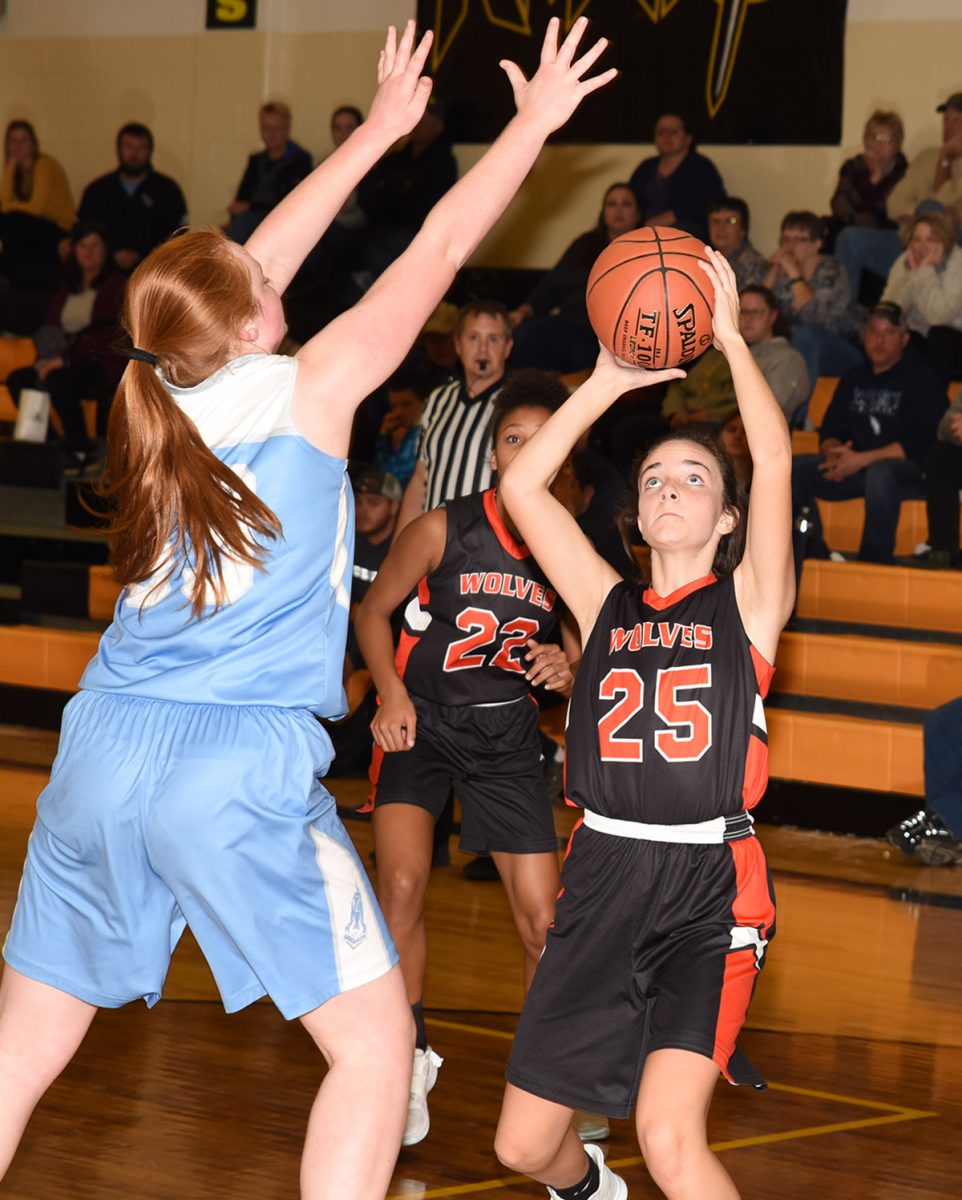 Jersi Poppa eyes the basket in the Lady Wolves’ win over West Nodaway in the South Holt Tournament.