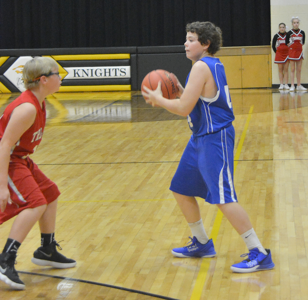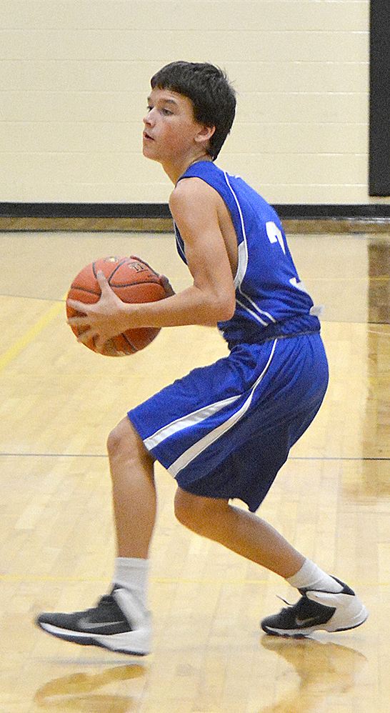 Wolf Owen DeRosier eyes the court in the East Atchison game against West Nodaway during the South Holt Tournament.
