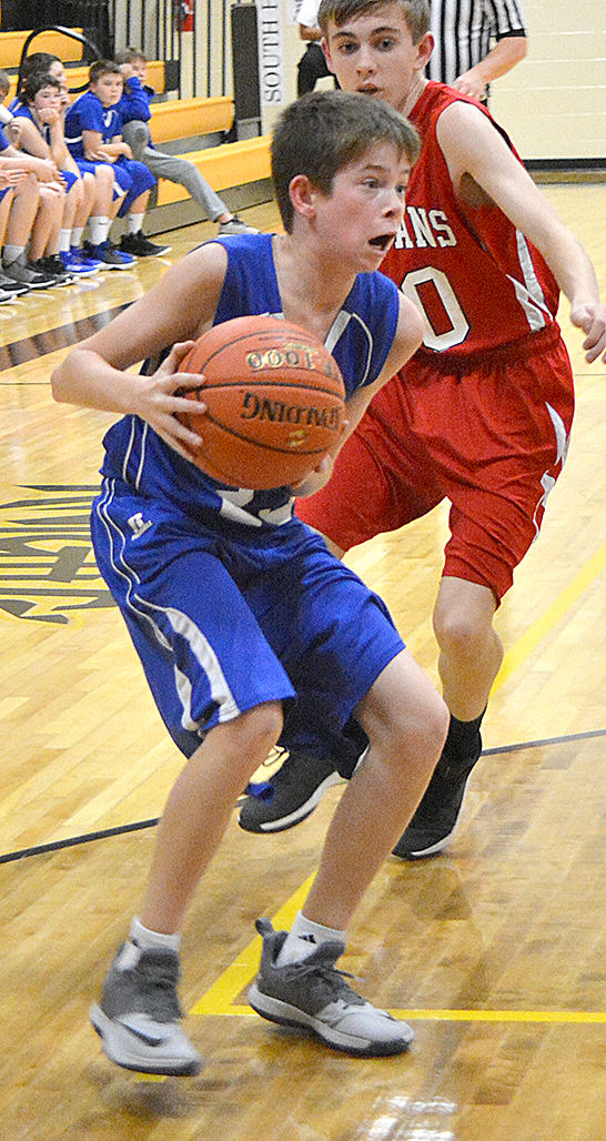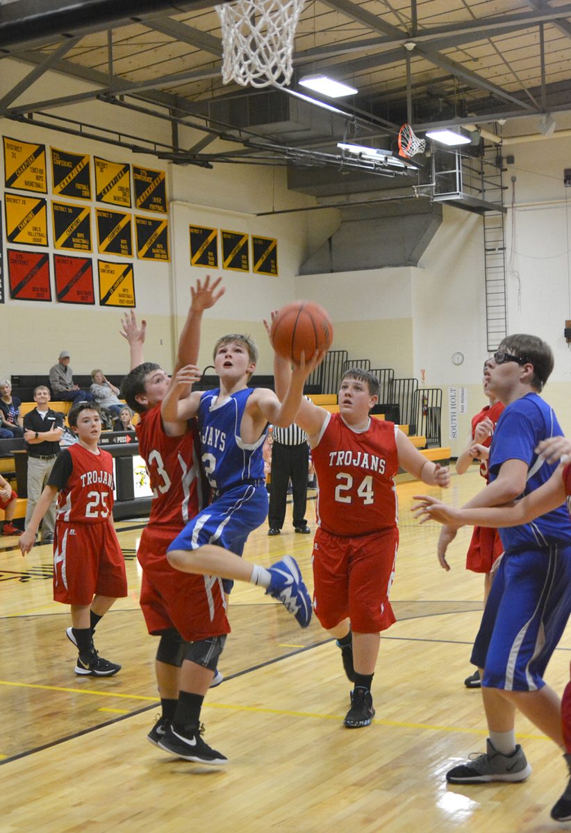 Blue Jay Reed Miller keeps the ball away from defenders in the South Holt Tournament.