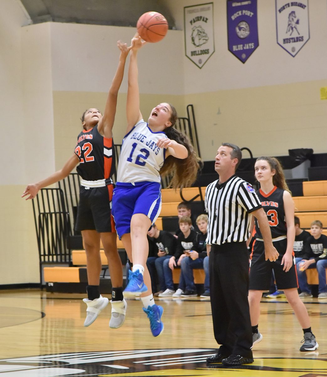 RP’s Rylee Jenkins gets the jump ball away from EA’s Keena Merriweather in the South Holt Tournament.