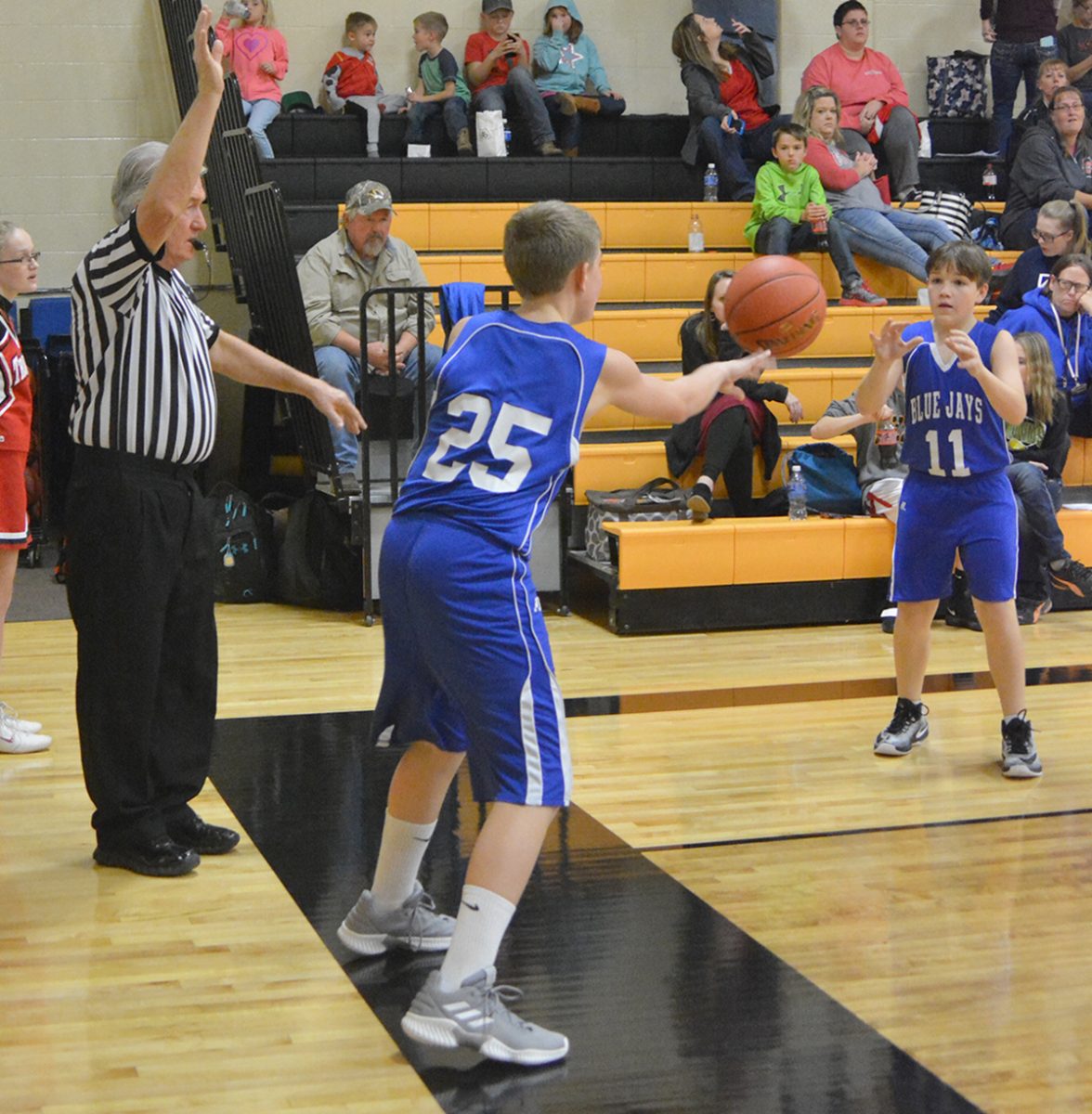 Blue Jay Clint Steffen makes a pass inbounds to Ozey Hurst in the South Holt Tournament.