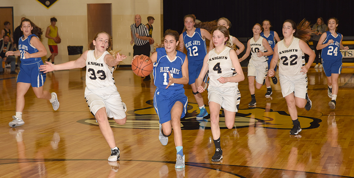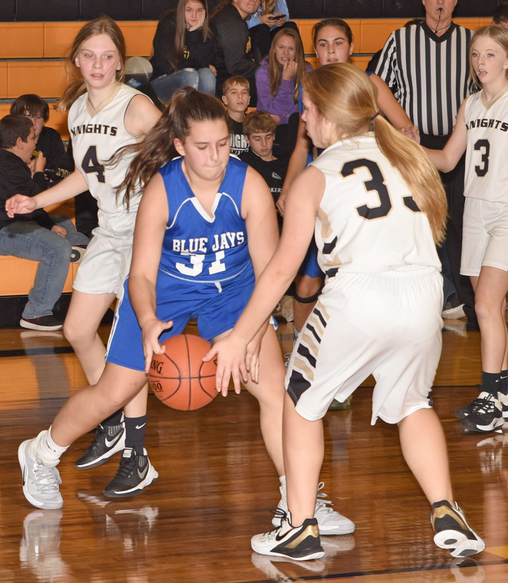 Rock Port’s Avery Meyerkorth drives the ball toward the basket in the Lady Jays’ South Holt Tournament win over the Lady Knights.