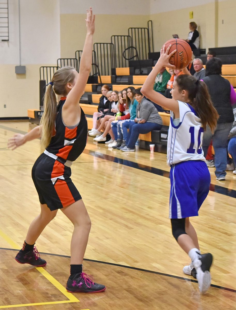 Alyson Wooten shoots for two in the East Atchison junior high win over West Nodaway in the South Holt Tournament.
