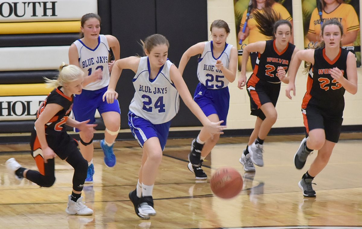 Rock Port’s Addison Maifeld gets the steal as teammates Rylee Jenkins and Chaney Vogler and Lady Wolves’ opponents Grace Oswald, Jersi Poppa, and Claire Martin run to keep up in the Lady Wolves’ South Holt Tournament championship win.