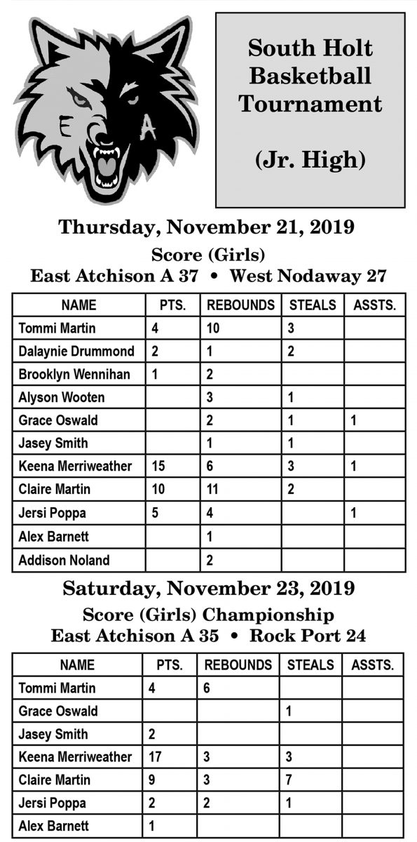 The East Atchison Lady Wolves won the South Holt Tournament in Oregon, Missouri, Saturday, November 23, 2019, by defeating the Rock Port Lady Blue Jays. Pictured are team members, from left to right: front row – Alex Barnett, Dalaynie Drummond, Tommi Martin, Jasey Smith, Grace Oswald, and Claire Martin; and back row – Coach Joe Unternahrer, Brooklyn Wennihan, Jersi Poppa, Addison Noland, Keena Merriweather, Alyson Wooten, and Assistant Coach Michelle Henry.