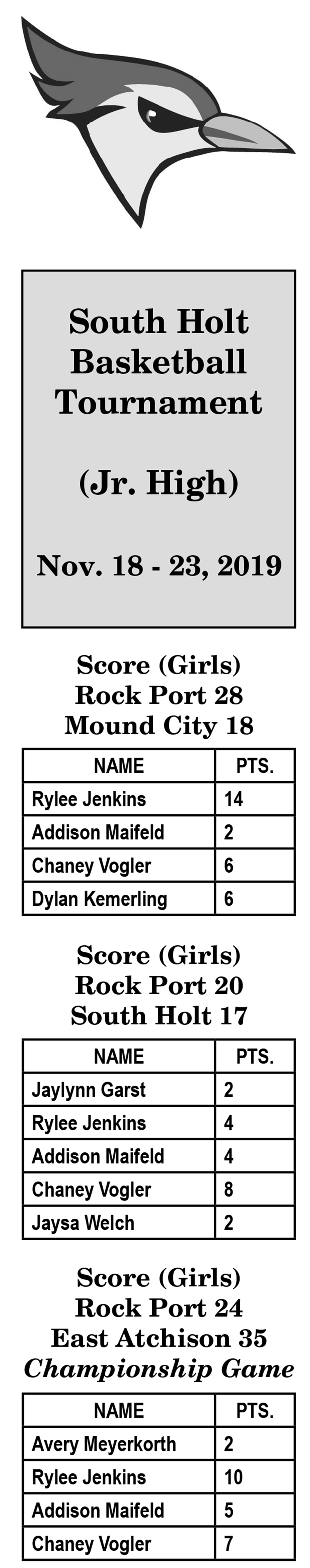 The Rock Port Lady Blue Jays placed 2nd at South Holt Tournament in Oregon, Missouri, Saturday, November 23, 2019. Pictured are team members, from left to right: front row – Addison Maifeld, Chaney Vogler, Jaylynn Garst, and Avery Meyerkorth; and back row – Rock Port Superintendent Ethan Sickels, Claire Spiegel, Rylee Jenkins, Dylan Kemerling, Jaysa Welch, Jayme McEnaney, and Head Coach Gary Davis.
