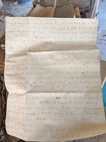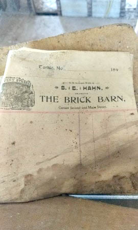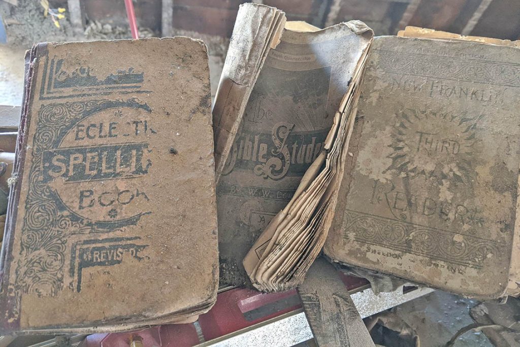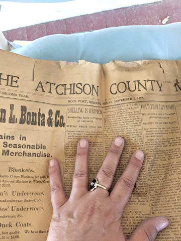 Raechel and Mark Schoonover purchased a building at the corner of Elm and Third streets in Tarkio. The couple has been renovating it as weather allows and recently came across some interesting finds hidden in the walls. Several late 1800 items including a letter, spelling book, song sheet, a ledger, and a newspaper, to name a few, were discovered.