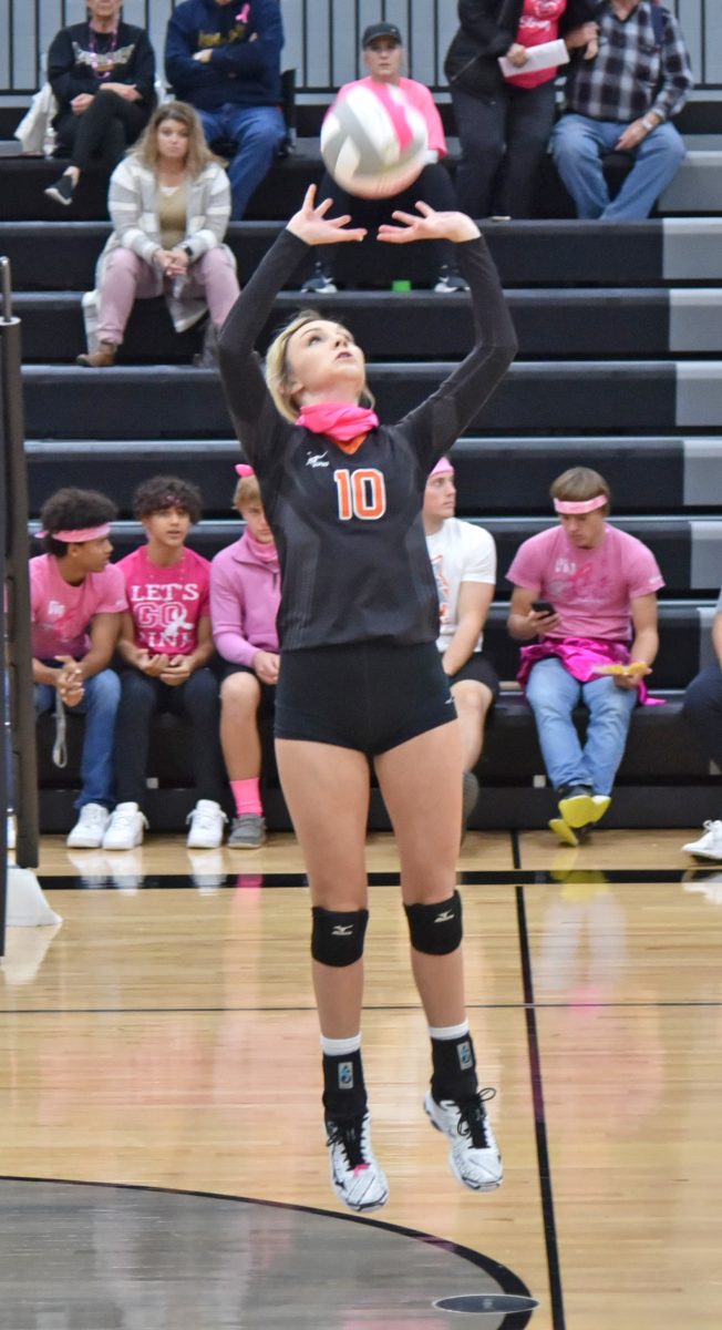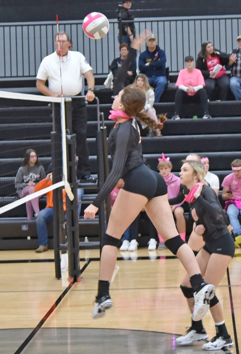 With the hit is Natalie Hedlund in the Lady Wolves Pink Out volleyball games October 21. Natalie had a total of 13 kills in the two matches.