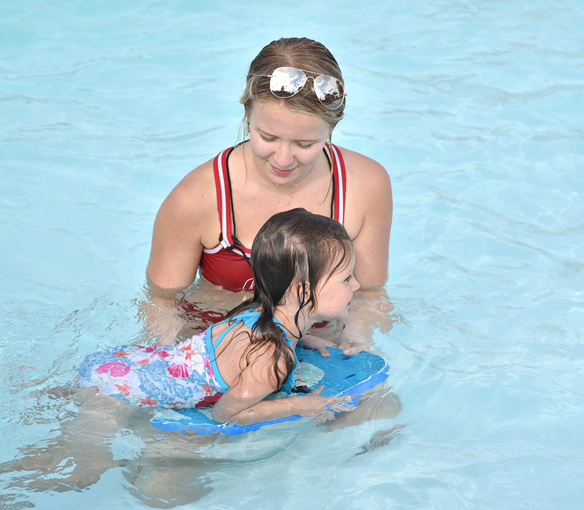 Lifeguard Tommi Lee Martin lets her little swimming partner know she won’t get in her way when she jumps off the side of the pool during Tarkio Municipal Pool swim lessons.