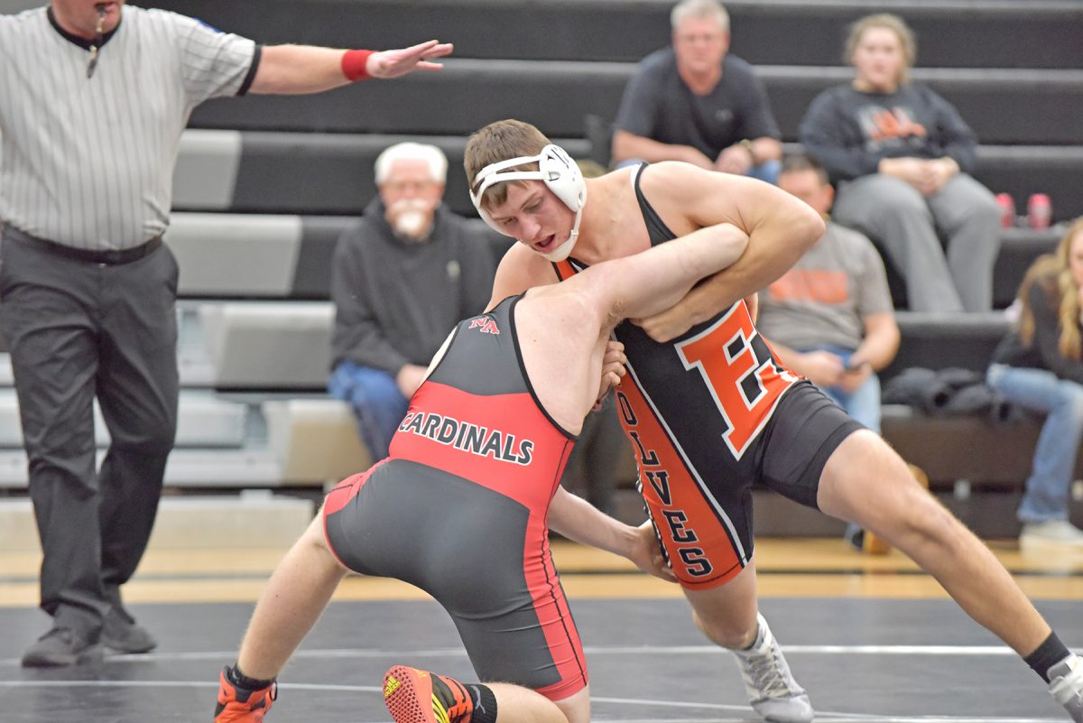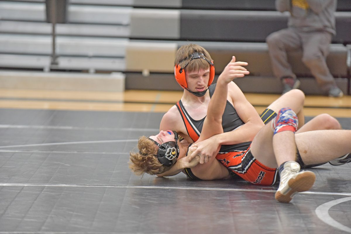 Linkin Murry works over Stanberry’s Aiden Law, winning by decision the 145 lb. weight class of the East Atchison tri-meet.