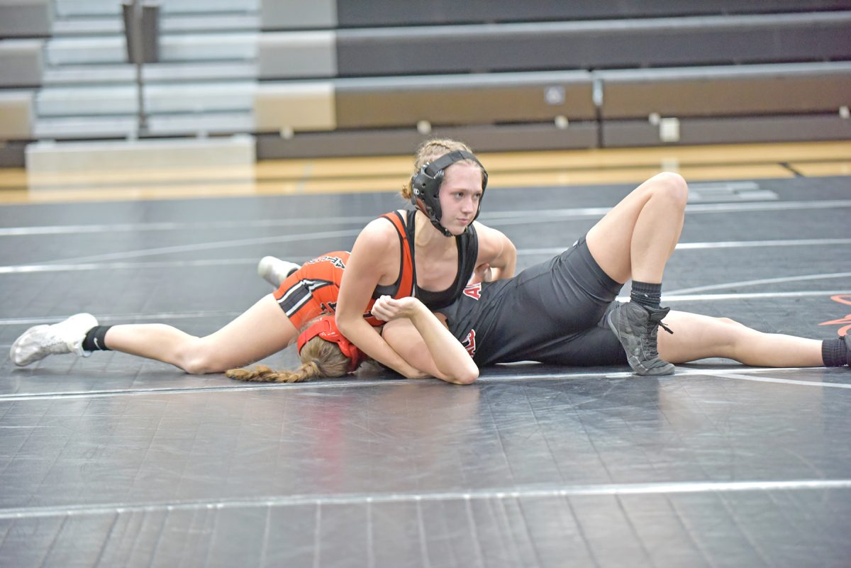 Brooklyn Wennihan pins her North Andrew opponent in the 115 lb. weight class of the East Atchison tri-meet.