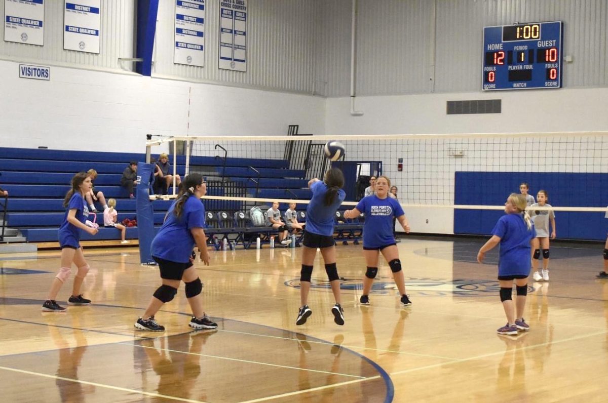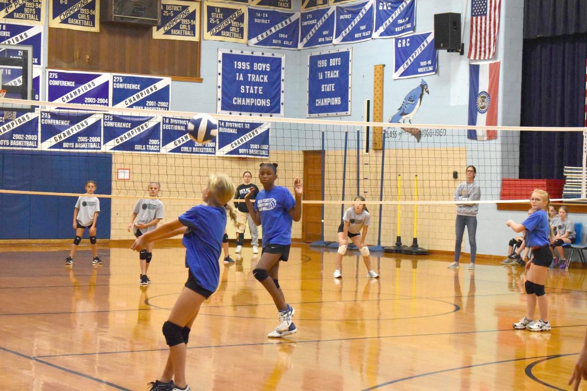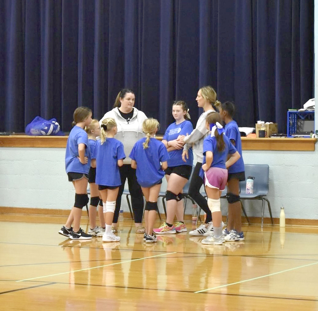 The 5th grade team listens to their coaches, Wendy Hays and Jayme Wood. Team members are Avery Schomburg, Clara Hayes, Jovie Millsap, Maeve Roup, Harper Wood, Kenni Davis and Aleyda Clodfelter. Rock Port hosted the 5th and 6th grade volleyball tournament Saturday, October 8. The 5th grade team won one match and lost two.