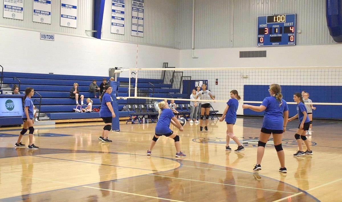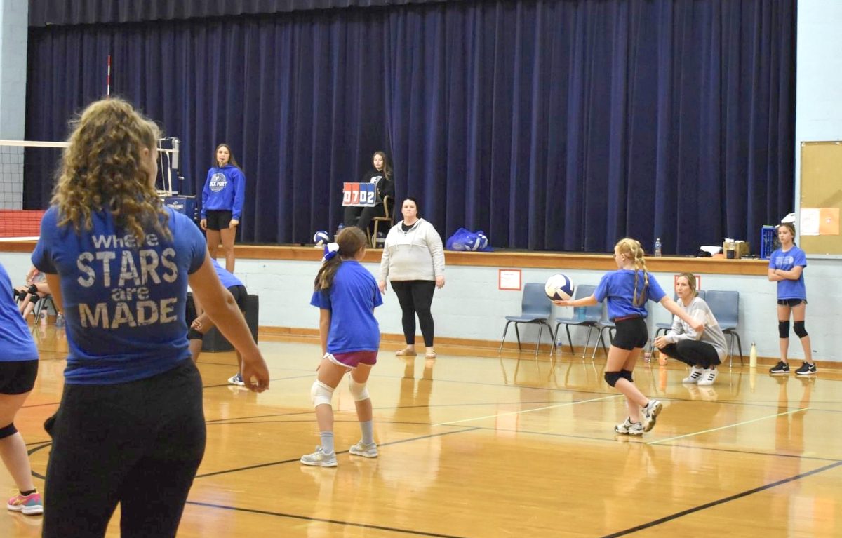 Sixth grader Jaecy-Mae Makings passes the ball. The 6th graders were 5-2 in sets, playing three games. They won one set against Shenandoah and lost two sets. They also played Hamburg (won both sets), and EA (won both sets). Sixth graders on the team are Adrianna Wallace, Millie Ripley, Katelynn Rouse, Alexi Stoner, Ona Henriksen, and Jaecy-Mae Makings.