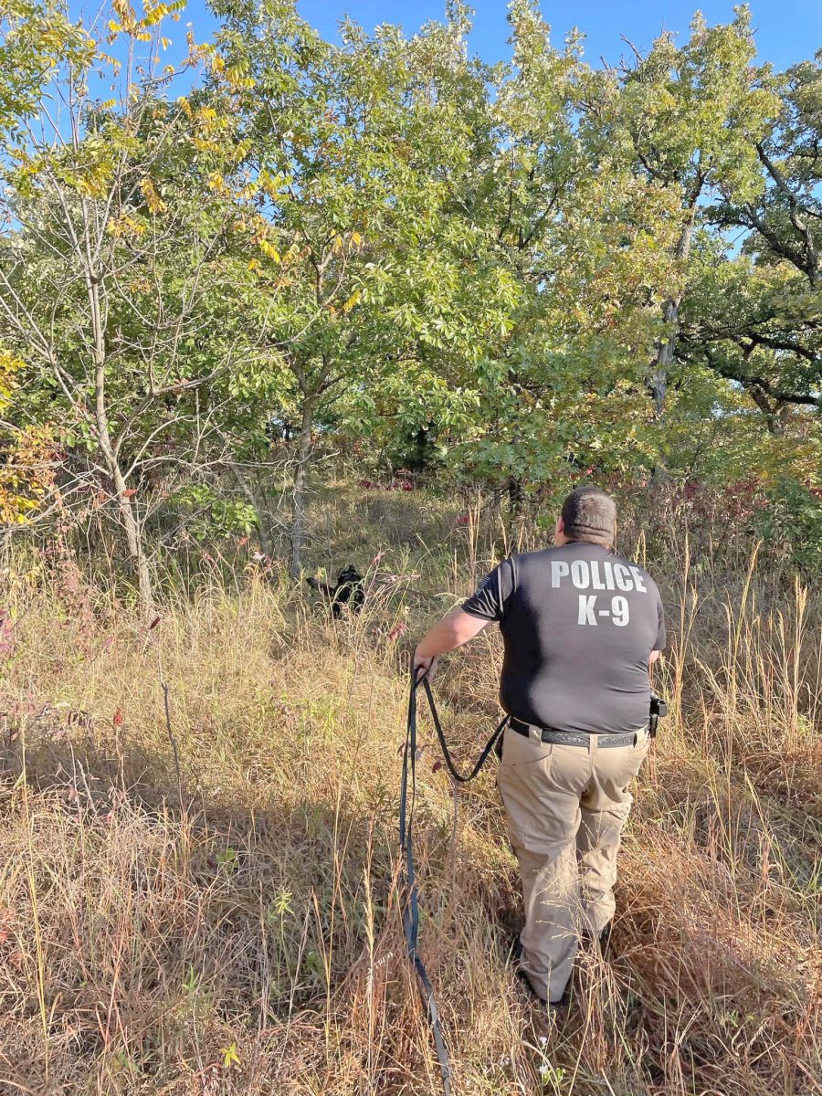 Hemi’s recertification test included narcotics detection in three settings, including buildings, vehicles, and parcels. The dogs were also given a basic tracking scenario in woods and fields. Three judges picked the top two dogs to compete for a Master Tracker award. Officer Dorrel and Hemi and an officer and dog duo from Mills County, Iowa, were selected. The test was much harder than the basic tracking and had Officer Dorrel and Hemi tracking a scent through extremely dense woods and underbrush, through fields, and over a road and through a barbed wire fence. Due to Hemi’s tracking performance and Officer Dorrel’s handling of him and recognizing his cues, the two were presented the Master Tracker award.