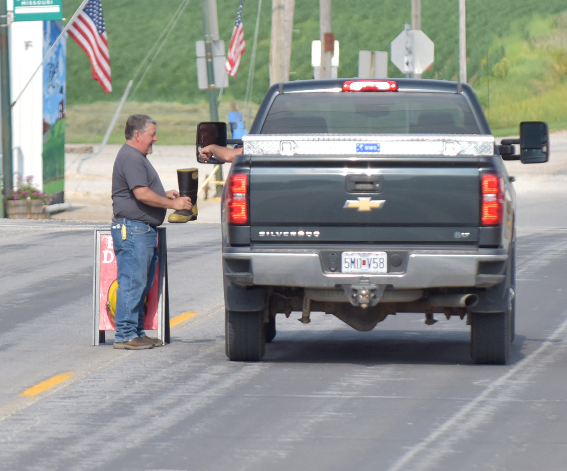 Kent Fischer gives a donation to fireman Archie Agnew during the boot drive that the Fairfax fireman have every Memorial Day weekend.