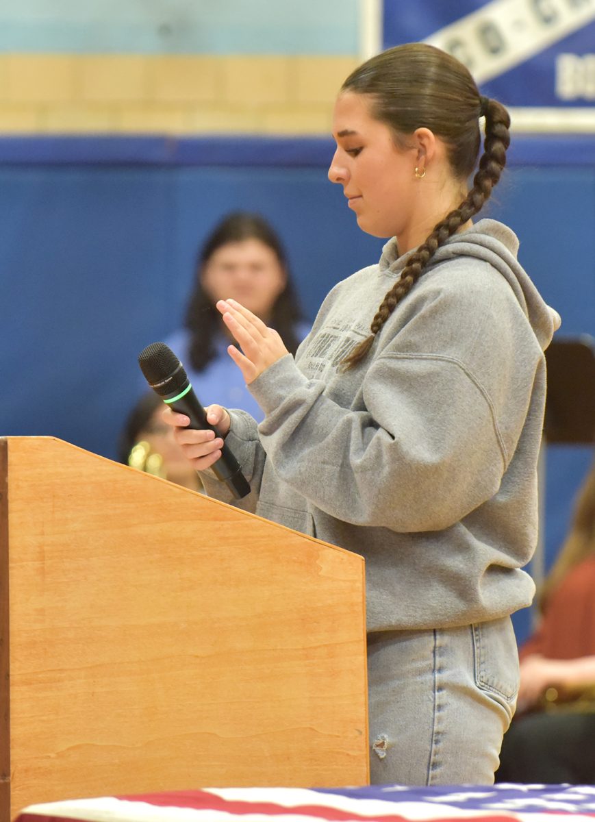 Tarkio High School and West Point graduate Shae DeRosier was the guest speaker at the assembly. In a prerecorded message, 2nd Lt. DeRosier described his experiences in the military so far and thanked all veterans for their service and sacrifice. He is currently stationed at Fort Novosel, Alabama.
