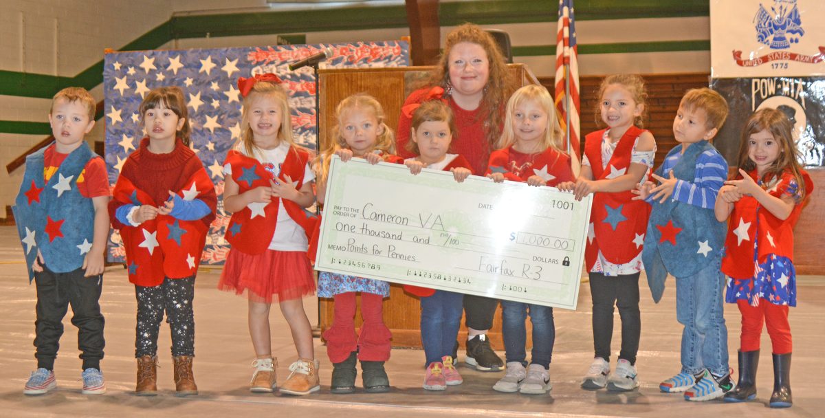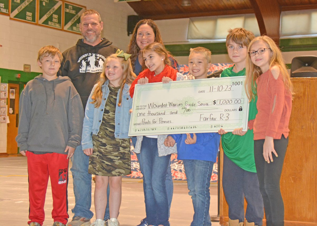 Fairfax R-3 School has been doing a Veterans Day service project called Helping Our Heroes Points for Pennies. Each class and the staff added pennies and bills (which were positive points) to their own containers and silver coins (nickels, dimes, and quarters) to other containers (which were negative points). The two classes with the most points (preschool and 4th grade) were selected to present the donations at the Veterans Day Assembly. A total of $1,000 was donated to the VA Home in Cameron, Missouri, to purchase puzzles, craft items, books, etc. Another $1,000 was donated to Wounded Warrior Guide Service (represented by Mike Lewis) to help offset costs for an upcoming hunting trip (food, lodging, travel, etc.).
