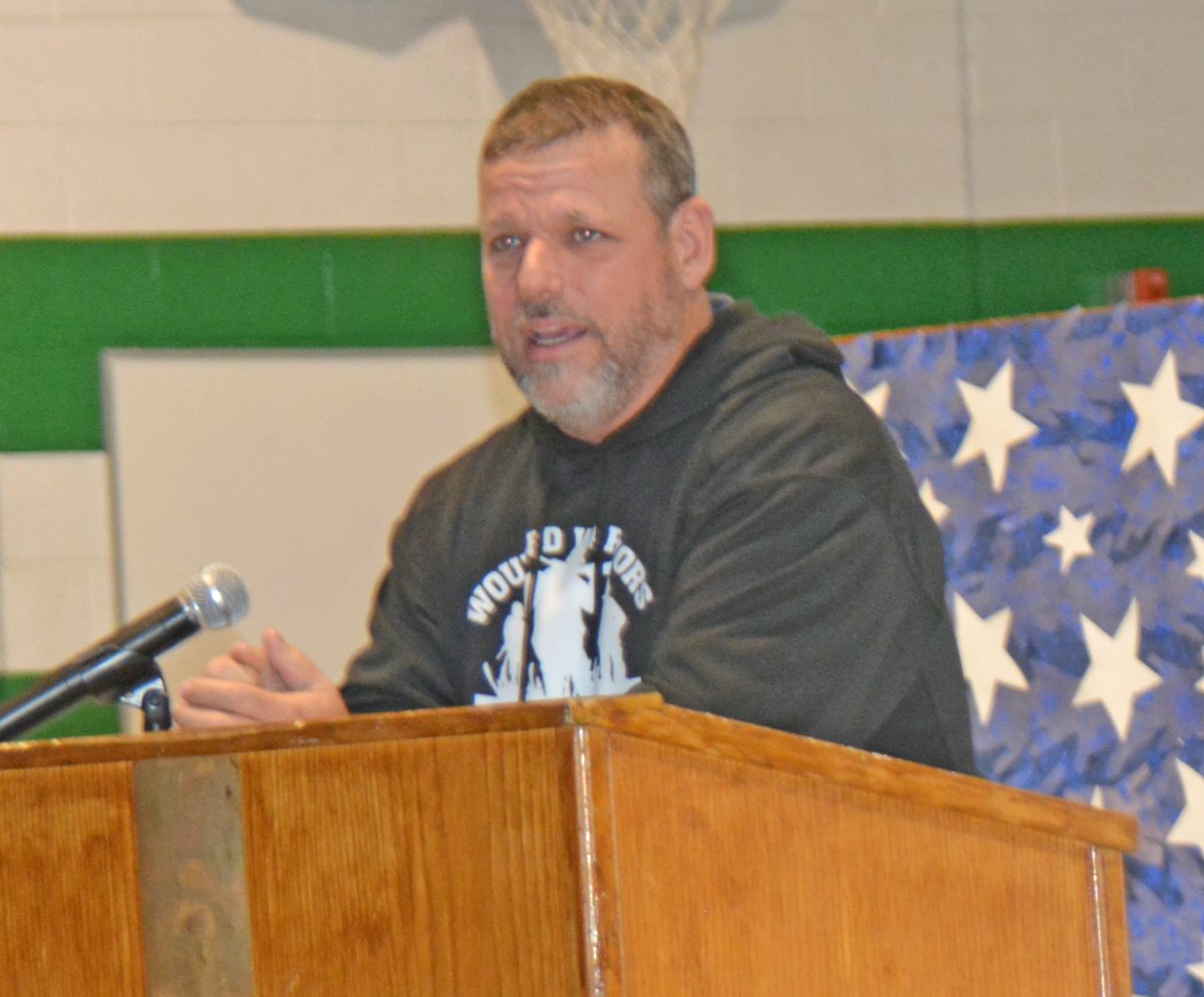 Roger Martin, at top, and Mike Lewis, above, were guest speakers at the Fairfax R-3 Veterans Day Assembly Friday, November 10, 2023, in the high school gym.