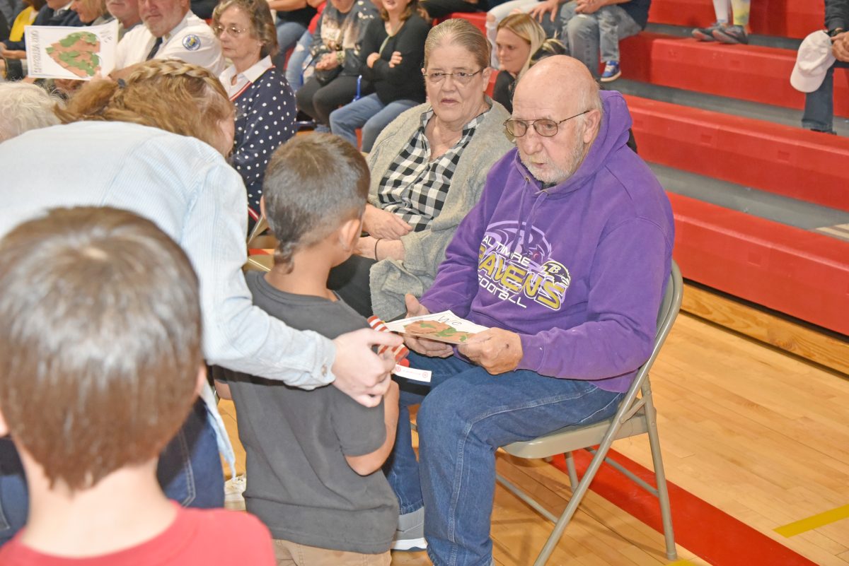 Local veteran Ralph Slemp receives a thank you card from a kindergartener at the Veterans Day Assembly at THS.