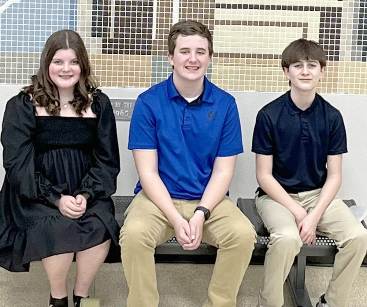 Congratulations to the Fairfax Junior High musicians who competed at the Northwest Missouri State University Solo Music Festival this past weekend in Maryville, Missouri. Caroline Larson, left, performed a piano solo and received a I rating (superior). The mixed brass trio comprised of Caroline Larson, Jaxson Smith, middle, and Deyton Burke, right, received a II rating (excellent). (Debra Wyatt photo)