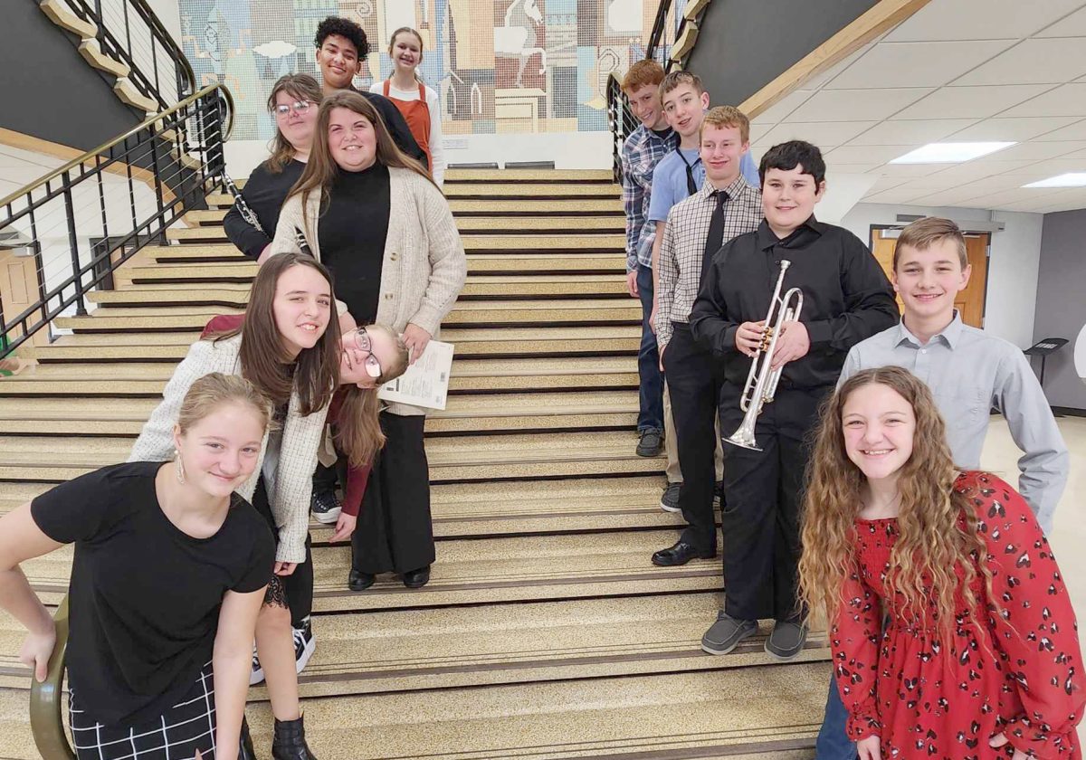 Congratulations to all of the Rock Port Junior High musicians who also competed at the Northwest Missouri State University Solo Music Festival. The students were accompanied by Richard A. Boettner on piano. The students were given one of two ratings: (I) Superior, and (II) Excellent. Rock Port’s individual results follow: I – Brandon Athen (trumpet), Cooper Daugherty (alto sax), Logan Kish (flute and vocal), Levi Lucas (baritone), Amelia Mason (tambourine), Eliza Mason (timpani), Kennedi Seiter (snare drum), Isaac Shimmel (snare drum), Stella VanGundy (snare drum), and Maddie Wilroy (clarinet); and II – Isa Kroeger (trumpet), Wyatt Huntley (trumpet), and Katelynn Rouse (clarinet). (Abby Palmer photo)