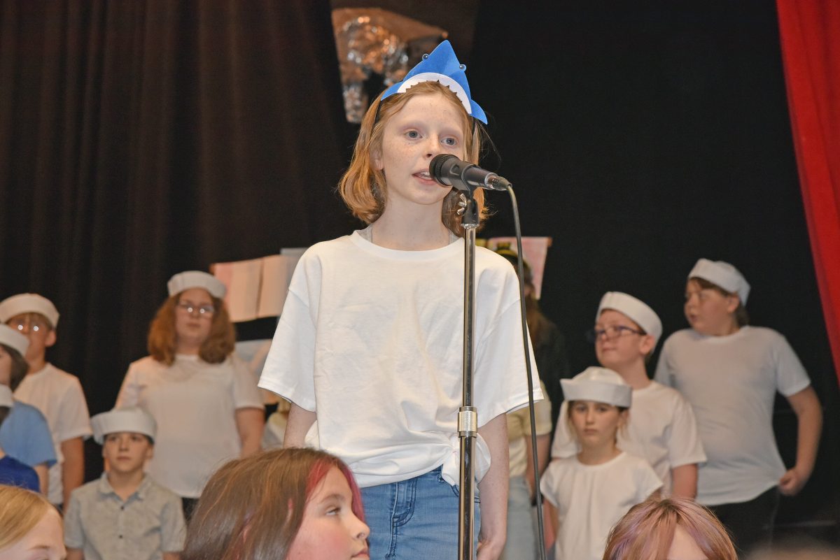 “The High Seas: Let’s All Set Sail, A Nautical Musical of Sailors, Pirates, Sea Creatures and More!” by John Jacobson and Walter Jack was presented by Tarkio Elementary 4th and 5th graders Friday, April 12, 2024, in the Tarkio High School Auditorium. Directed by Melody Barnett, the pirates, sailors, mermaids, and sea creatures entertained a full house of family and friends. “The sailors are on their way to the Annual Sea-Faring Singing Contest. They are determined that this year they will not lose out to those scurvy pirates and their leader, The King of the High C’s! The pirates are also readying for their journey to the singing contest – singing a rowdy pirate song and doing a pirate dance. They always win because of their incomparable weapon – The King of the High C’s. On their way, the sailors are lured into the rocks by the singing mermaids, who cause a terrible shipwreck. The fish and creatures of the sea rescue the sailors and lead them to a deserted island. The pirates sail right by them on the way to the contest. The pirates don’t feel right about leaving the sailors on the deserted island and return to them to take them along to the singing contest to create a mass choir that will surely win the prize. All ends in perfect harmony!”