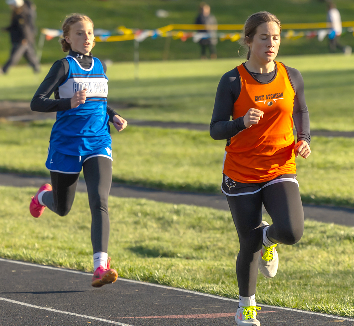 The Rock Port (RP) girls’ team won the meet with 169 points. Other team placings and points were: 2nd, East Atchison (EA), 69; 3rd, Worth County (WC), 66; 4th, Mound City (MC), 63; 5th, Albany (A), 26; 6th, South Holt (SH), 22; 7th, Union Star (US), 13; 8th (tie), North Andrew and Nodaway Valley (NV), 12; 10th, North Nodaway (NN), 7; and 11th, Northeast Nodaway (NEN), 6. Hamburg (H) also participated.