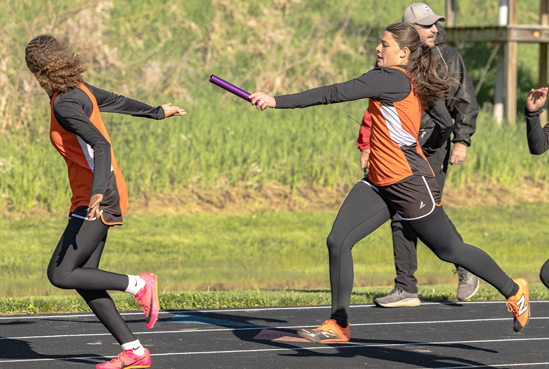 Rhoni Caudill passes the baton to Brilee Slemp in the 4×100 meter relay.