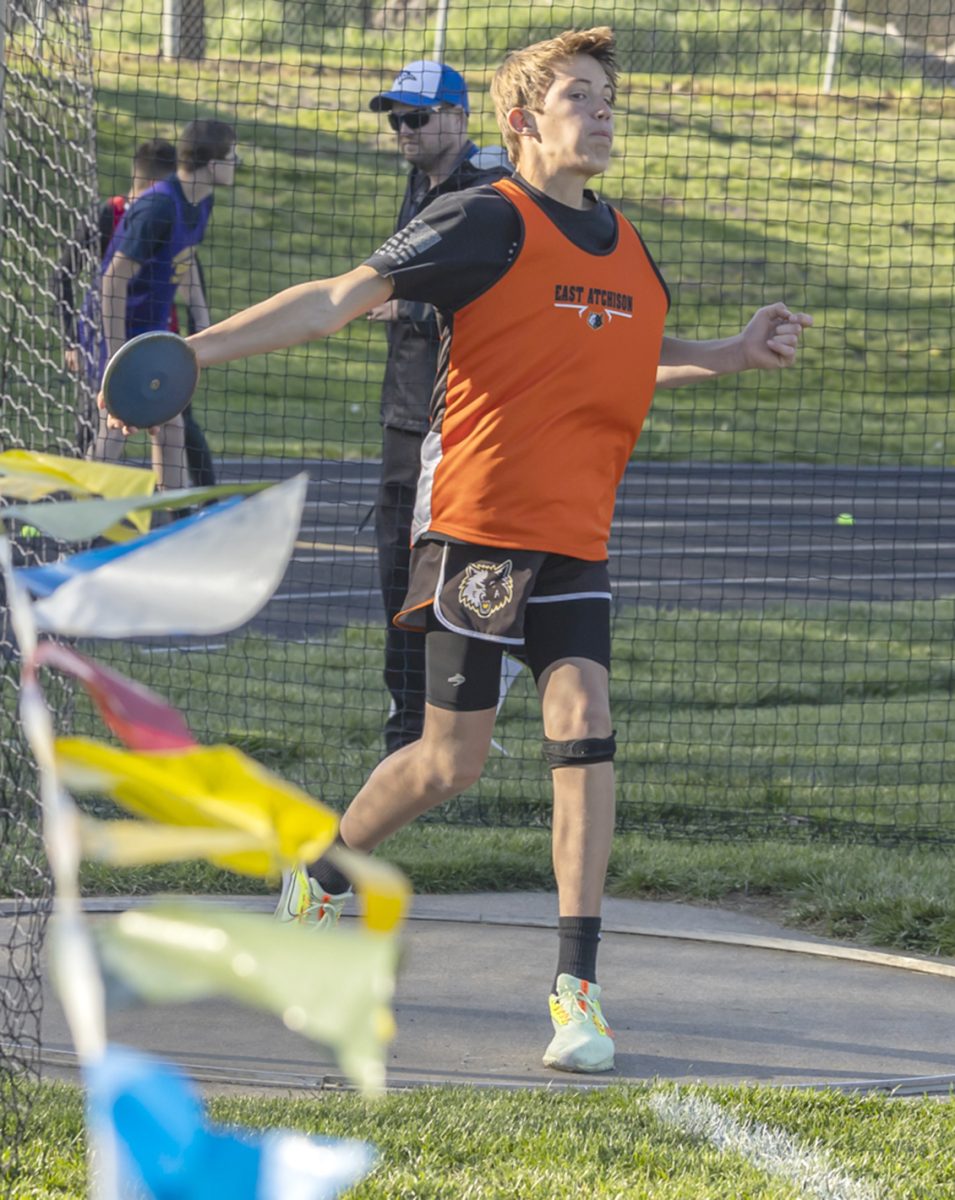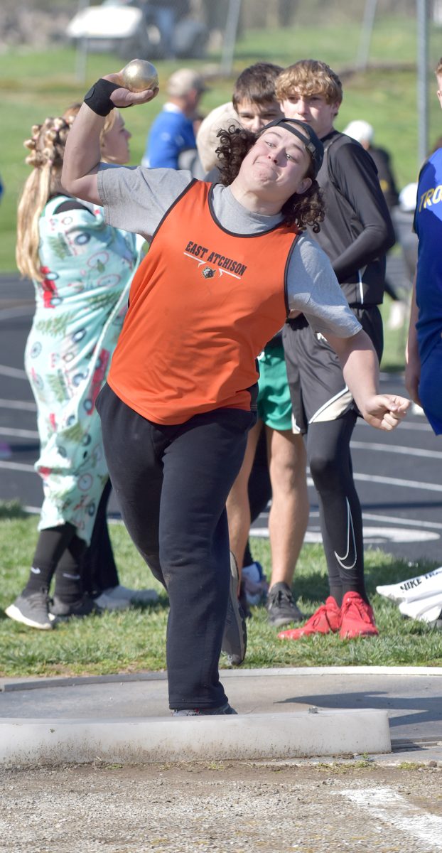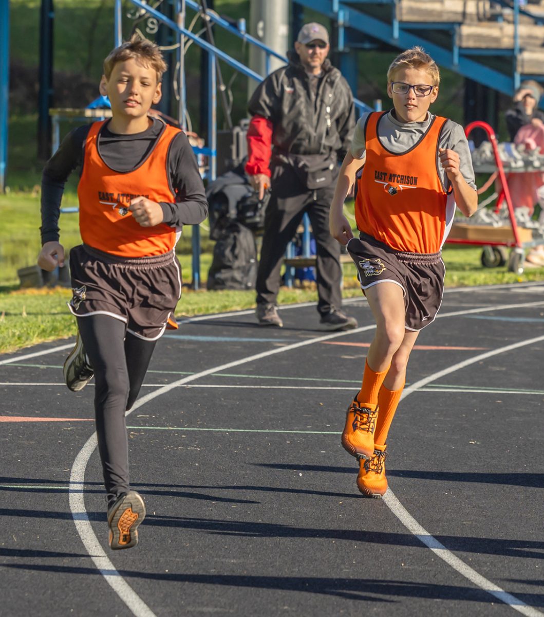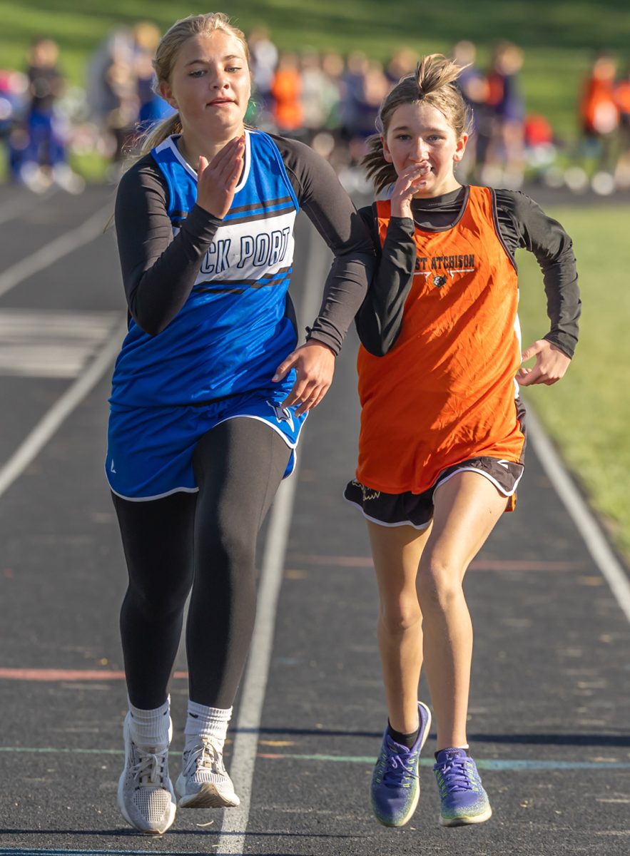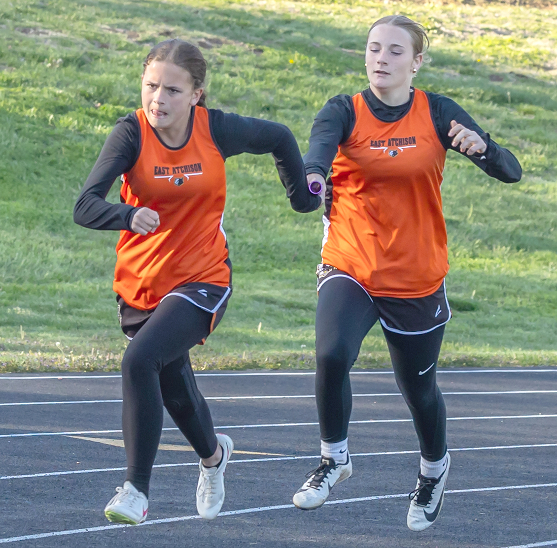 The East Atchison girls 4×200 meter relay took first place with a time of 2:04.32. Pictured above is the exchange between Azlynn Wiley and Teagan Taylor. Makenna Caudill led off and Taya Windham anchored the relay.