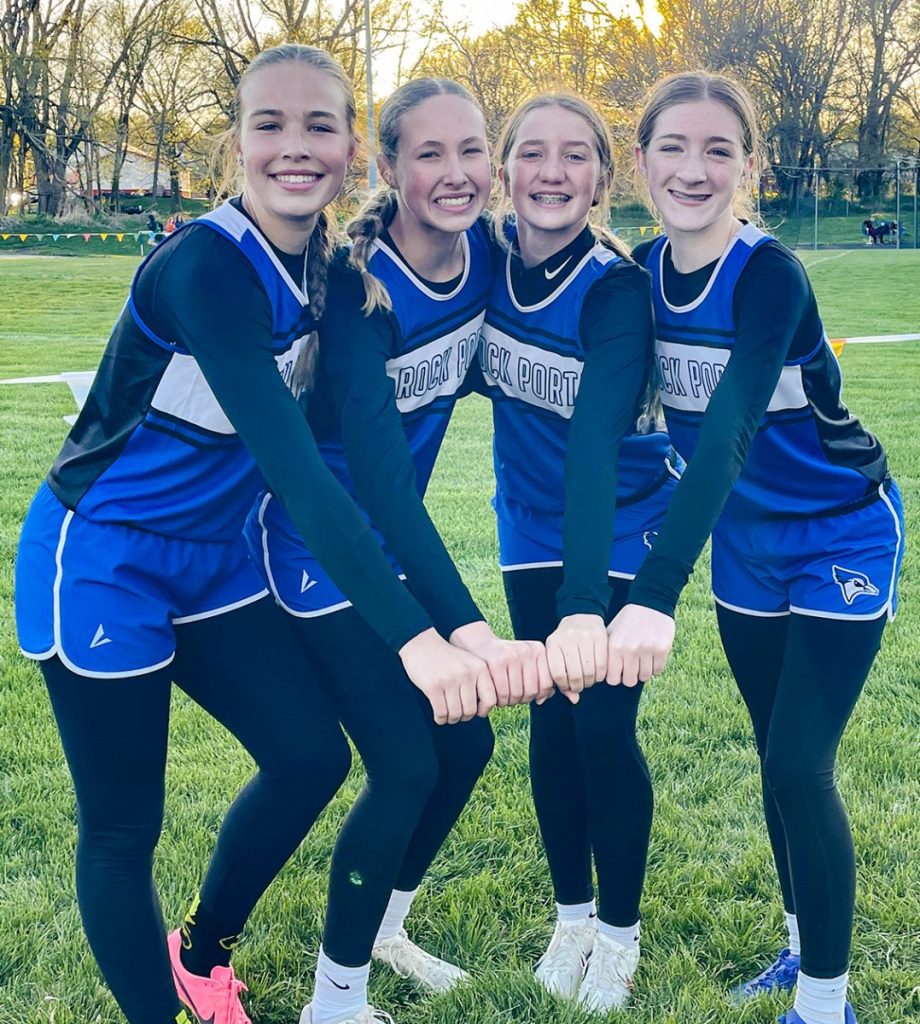 The Rock Port girls’ 4×400 meter relay team set a new record with a time of 4:35.28 in the Junior High Blue Jay Relays. Members, from left to right, are Audrie Meyerkorth, Braylyn Wood, Talyn Amthor, and Reese Herron.