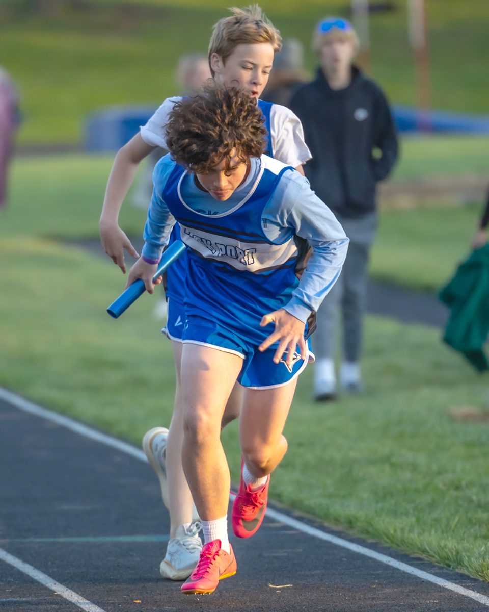 Archer Meyerkorth hands off to Tennyson Lansdown in the 4×400 meter relay. Rock Port placed 4th in the race.