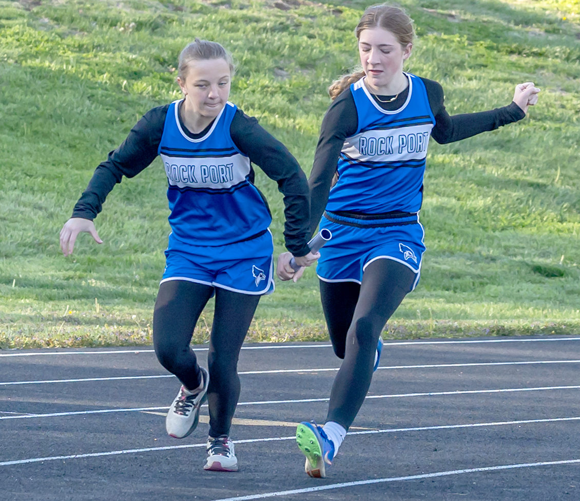 Reese Herron hands off to Kennedi Seiter in the 4×100 meter relay. The Rock Port girls took first in the event.