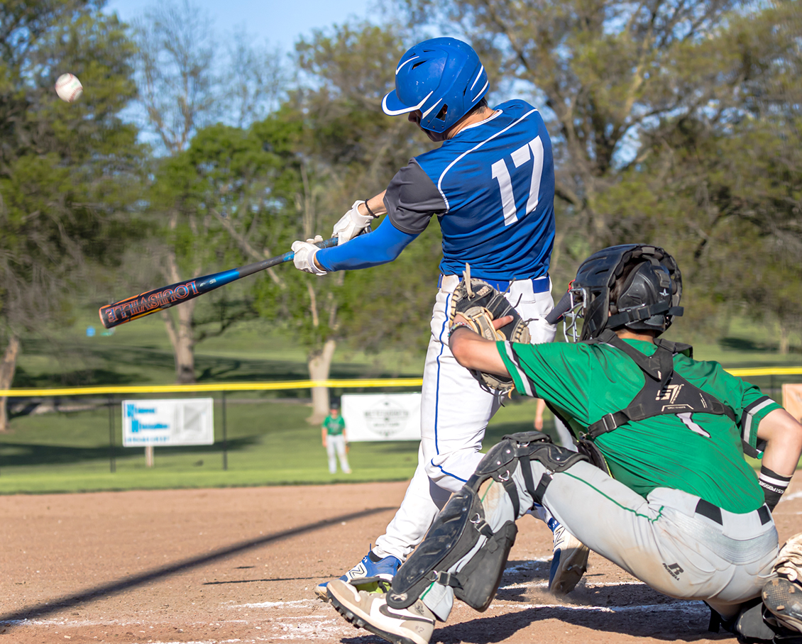 Corbyn Jakub gets a hit against Albany in Rock Port’s 13 to 3 win on Tuesday, May 7, 2024.