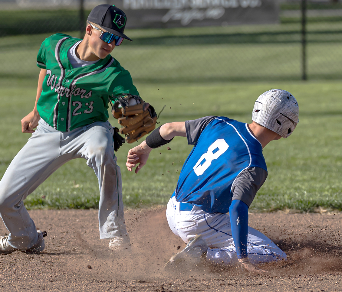 Just in the nick of time, Dylan Lair slides in to second on a stolen base.