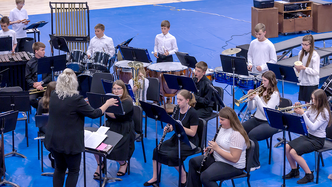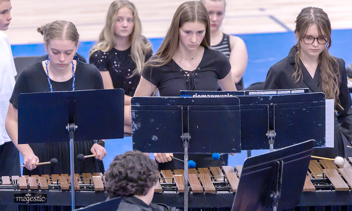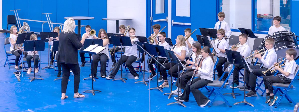 The fifth grade beginning band played “March Across the Seas,” “Banana Boat,” and “Indigo Rock.” Musicians in the fifth grade beginning band include: Emma Roberts, Emily Herrington, Caisyn Hall, and Joci Culp, flutes; Kambrie Driskell, Ali Ellis, Rogan McCown, and Nella Steuter, clarinets; Mason Hale, alto saxophone; Isaac Dougherty, Locke Chaney, and Jackson Hogue, trumpets; Cy Vogler, Lane Seeley, Kipton Waigand, Jack Bailey, and Deveni Barth, trombones; Elaina Kroeger, baritone; and Anthony Masonbrink, Harper Roup, and Alex Gibson, percussion.