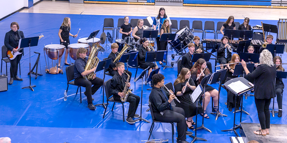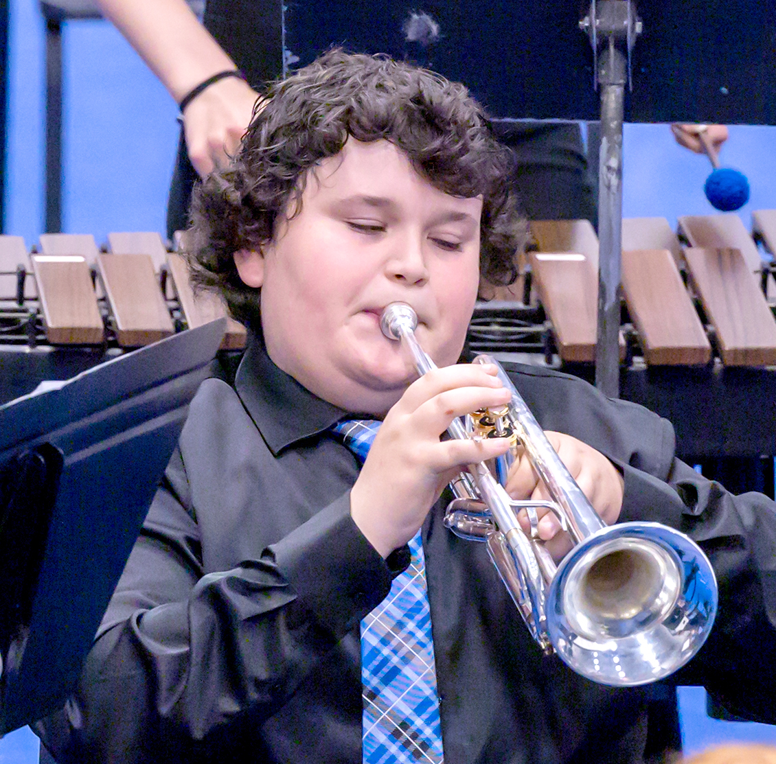 The sixth and seventh grade combined band performed “Pirates’ Cove Adventure,” “Gregorian Chant & Ritual,” and “Rain Dance.” Cooper Daugherty, Alisha Lomax, and Sophie Storm assisted. Musicians in the sixth and seventh grade combined band include: Alisha Lomax (senior, cadet teacher), flute; Maddie Wilroy and Katelynn Rouse, clarinets; Isabella Kroeger and Clara Hays, trumpets; Jadyn Jakub, baritone; and Isaac Shimmel, Jaxson Hale, Briar Daugherty, Jolie Steuter, Maya Clodfelter, and Zeke Gebhards, percussion.