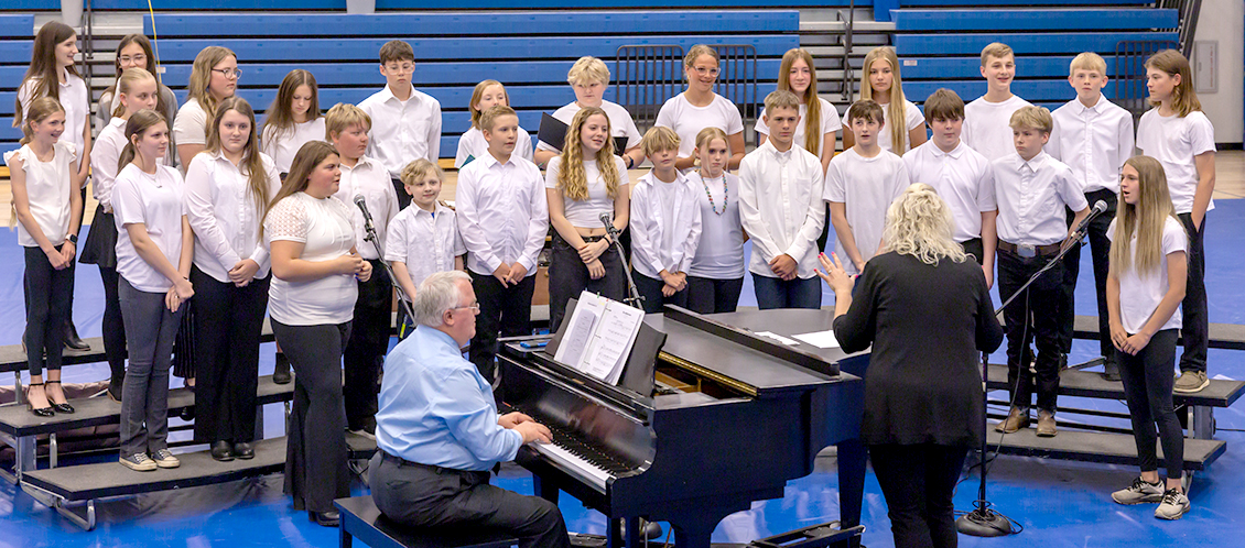 The seventh grade chorus performed “The Wellerman” (with soloists Maddie Wilroy, Katelynn Rouse, Tristan Struthers, Colt Seiter, Holdyn Moore, Fisher Smelts, Millie Ripley, Isabella Kroeger, Alexi Stoner, and Rozlyn McCown); “Risseldy Rosseldy” (with soloists Fisher Smelts and Alexi Stoner) and “4 Chords” (with speakers Tristan Struthers and Rozlyn McCown). Members of the seventh grade chorus include: Ellie Garst, Alexi Stoner, Millie Ripley, Isabella Kroeger, Maddie Wilroy, Ona Henriksen, Tenley Peshek, Fisher Smelts, Colt Seiter, Tristan Struthers, Reese Herron, Adrianna Wallace, Leah Meyerkorth, Grant Spiegel, Anna Weber, Stevie Gaines, Rush Lewis, Katelynn Rouse, Isaac Shimmel, Grady Cook, Jaecy Makings, Hunter Bolin, Malayna Gibson, Holdyn Moore, Jacob McMahon, Rozlyn McCown, Landon Melton-Burrell, Cameron Lotter, Jayven Hudson, and Blaise Krogen.