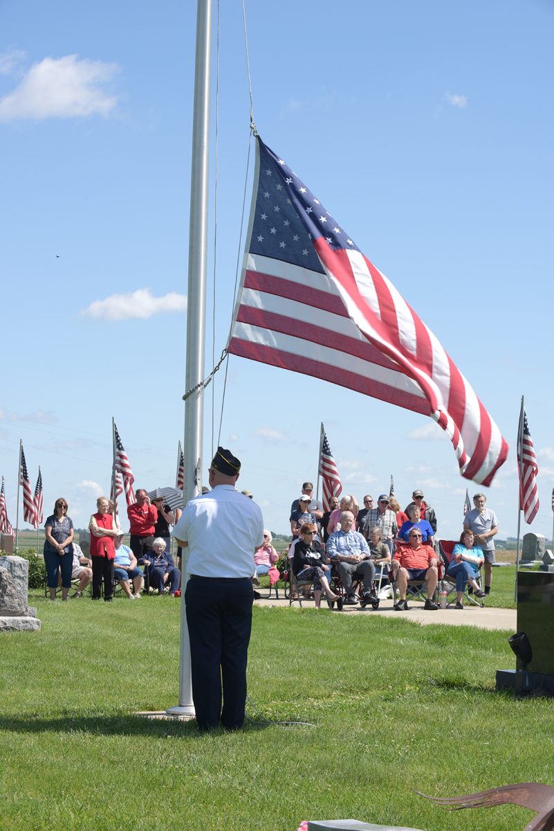 Attendees watch as the flag is lowered to half staff at St. John’s Cemetery.