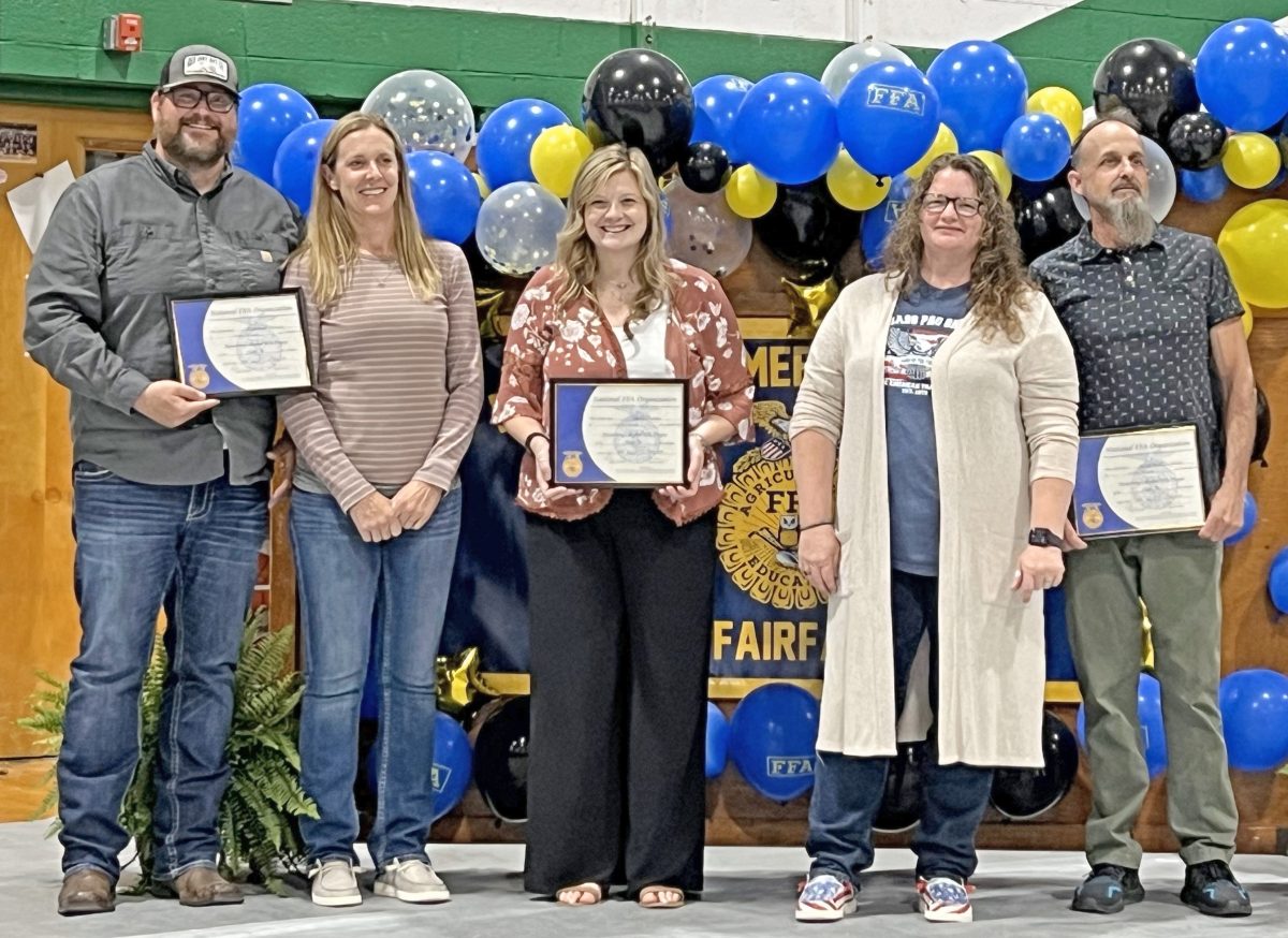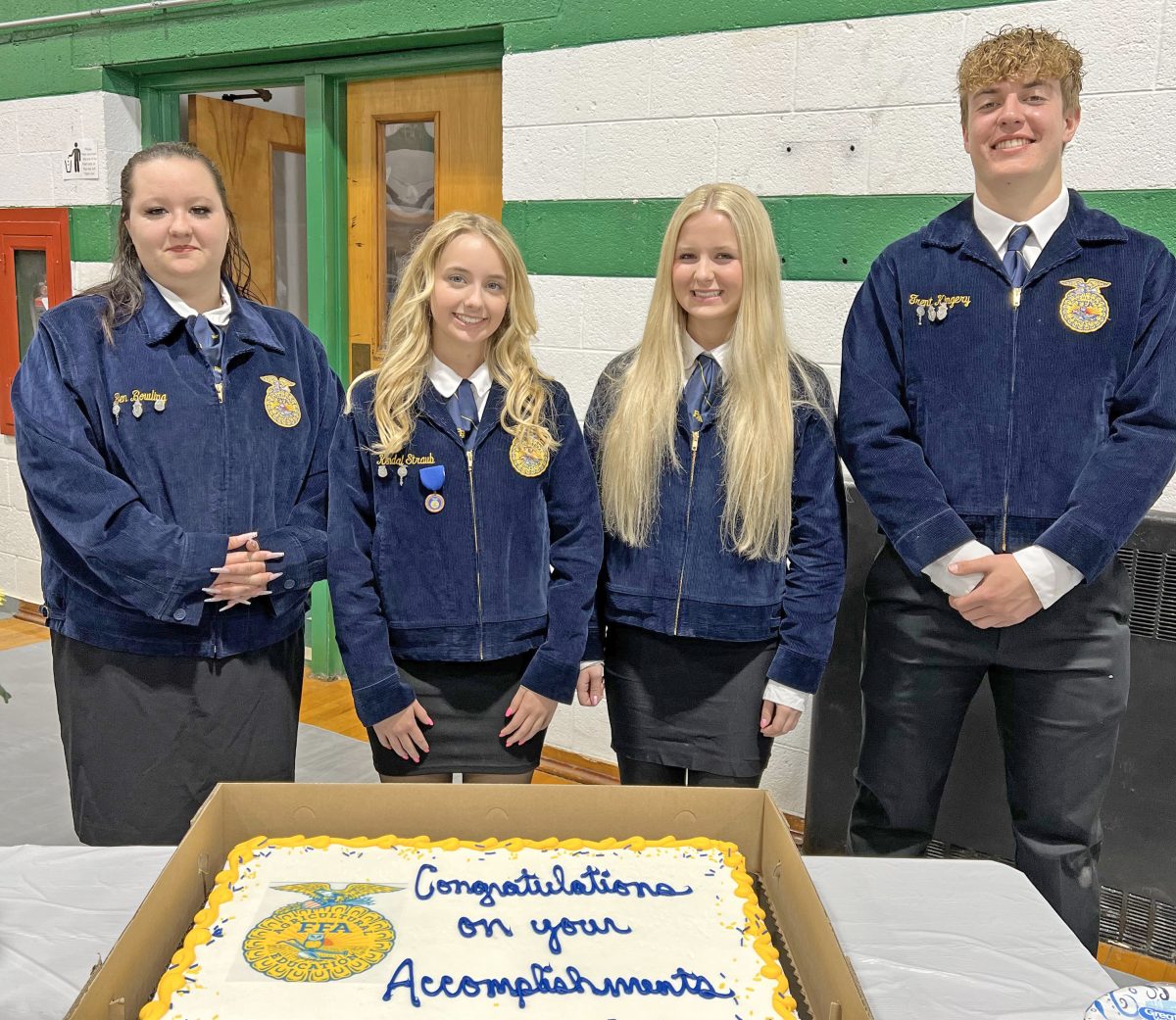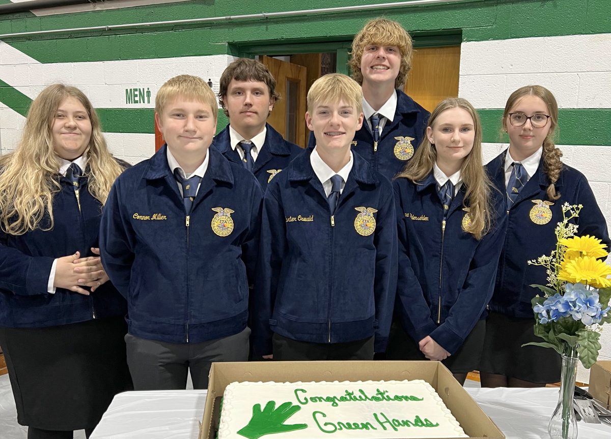 The chapter then recognized its CDE teams, LDE participants, and members of other events: Agronomy (fall contest) – Austin Helfers, Joaquin Hill, Tatem Johnson, Ryker Parks, and Charlie Smith; Dairy Foods (fall contest) – Lillie Auwarter, KayDee Duering, and Victoria Jamison; Entomology – Austin Helfers, Joaquin Hill, Tatem Johnson, and Bryon Ohlensehlen; Farm Management – Lillie Auwarter, KayDee Duering, Grace Oswald, Ryker Parks, Charlie Smith, and Bryon Ohlensehlen (for districts); Floriculture – Trent Kingery, Kendall Kingery, Kendal Straub, Clayton Vernon, and Bryon Ohlensehlen (fall contest); FFA Knowledge – Lexi Brown, Mason Kingery, Alex Martin, Connor Miller, Anna Ohlensehlen, Carter Oswald, and Chloe Vernon; State FFA Knowledge Team – Lexi Brown, Mason Kingery, Anna Ohlensehlen, and Chloe Vernon; Charlie Smith – 1st Place 2023 Area 1 Missouri Cattlemen’s Speaking, 2nd Place 2023 NW District Missouri Cattlemen’s Speaking, 1st Place 2024 Area 1 Advanced Division Public Speaking, 3rd Place 2024 NW District Advanced Division Public Speaking, and Missouri State FFA Degree; Kendal Straub – Missouri State FFA Choir; Lexi Brown – Alternate 2023 Area 1 Missouri Teach Ag Speaking, 4th Place 2024 Area 1 Creed Speaking, and Missouri State FFA Choir; Grace Oswald and Lillie Auwarter – 1st Place Area 1 Scrapbook- State Qualifying; Amelia Larson – 2023 National FFA Band and Competed in 2023 Area 1 Missouri Young Farmer/Young Farm Wives Speaking; Chloe Vernon – 2nd Place Area 1 Division 1 Prepared Public Speaking and 3rd Place NW District Division 1 Prepared Public Speaking; Anna Ohlensehlen – Competed in 2023 Area 1 Creed Speaking; Courtesy Corps – Charlie Smith, KayDee Duering, Mason Kingery, Anna Ohlensehlen, and Chloe Vernon; and Ag Ed on the Move – Lillie Auwarter, KayDee Duering, Bryon Ohlensehalen, and Grace Oswald.