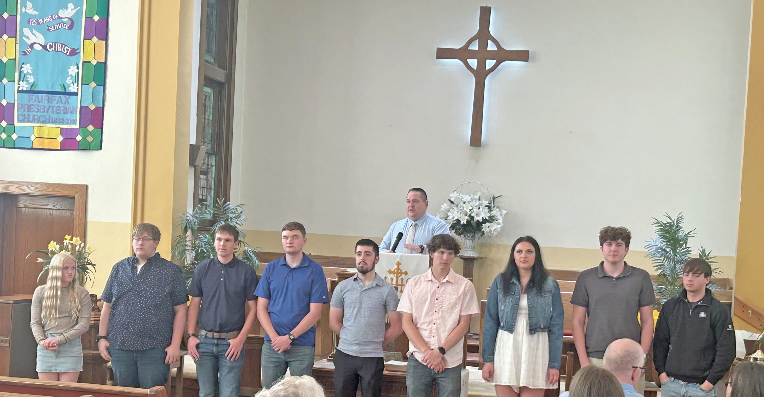 Baccalaureate services were held for the Fairfax High School Class of 2025 Sunday, May 4, 2025, at the Presbyterian Church in Fairfax. Jon Graves, a 1992 graduate of Fairfax High School, was the speaker. Pictured with Pastor Brad Dush are seniors, from left to right, Grace Oswald, Levi Brown, Bryon Ohlensehlen, Cowen O’Riley, Luke Swinehart, Clayton Vernon, Parker Woodring, Kendall Kingery, and Ryker Parks. (Jill Kingery photo)