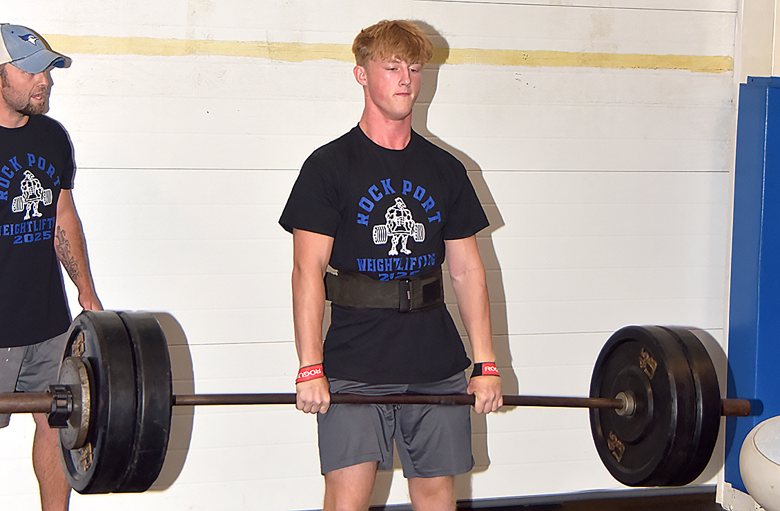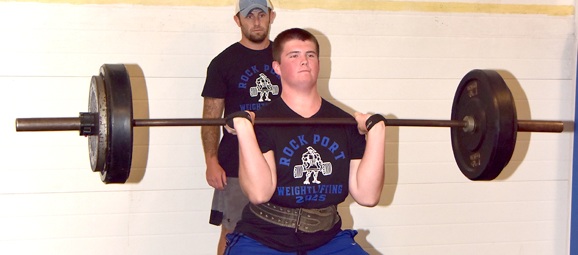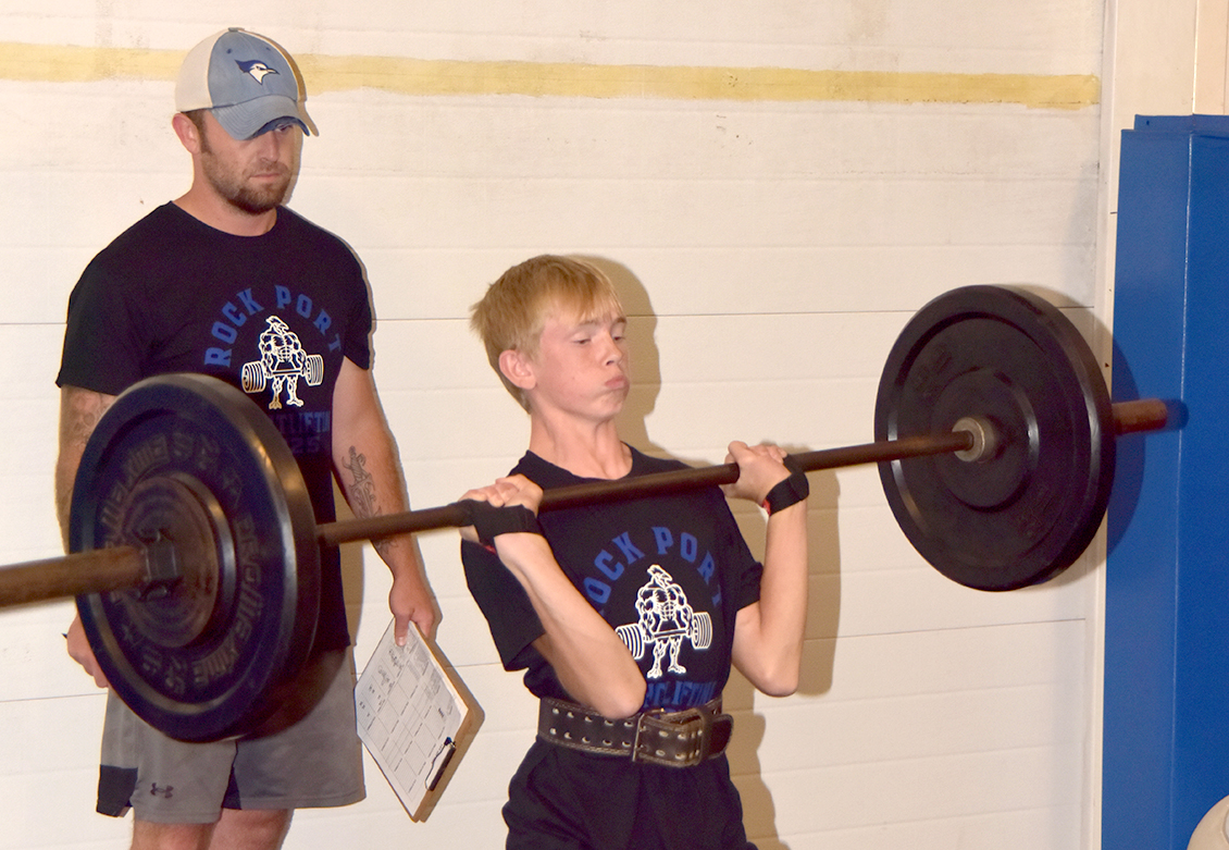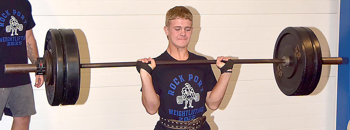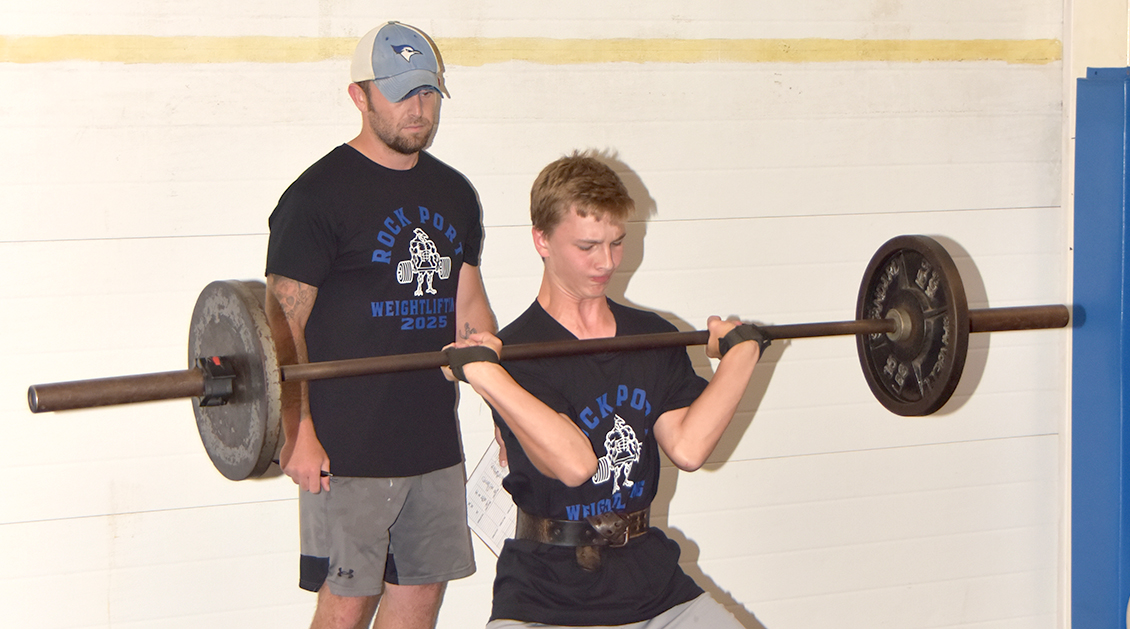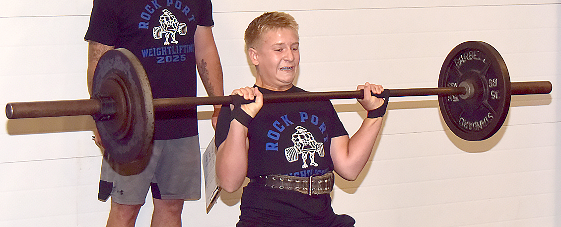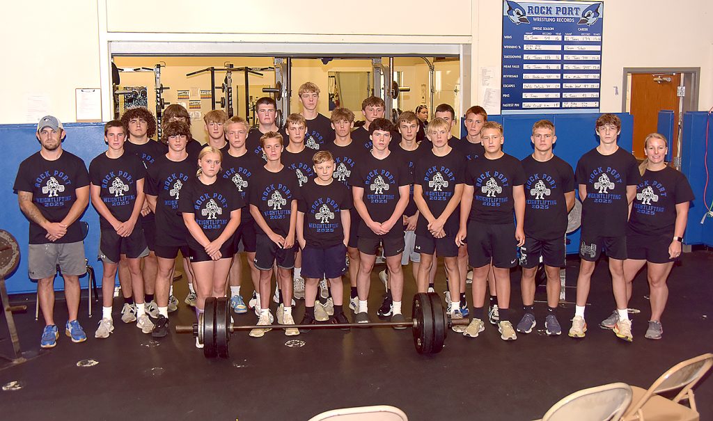 Rock Port’s summer weight lifting program wrapped up on Wednesday, July 30, 2025, with a lift-off of the hang clean. Pictured, from left to right, are: front row – Adrianna Wallace, Rush Lewis, Colt Seiter, Tennyson Lansdown, Grady Cook, Grant Spiegel, Blaise Krogen, Landon Melton-Burrel, and Coach Stephanie Parsons; middle row – Coach Dalton Jones, Ryzer Hale, Brock Holmes, Logan Ellis, Westyn Amthor, Tayden Cook, Isaac Shimmel, Jaxson Smith, and Wyatt Huntley; and back row – Quentin Jackson, Rylan Hunter, Desmond Chaney, Dayton Hayes, Reid Ellis, and Henley Mace. (See this week’s edition for more individual results.)