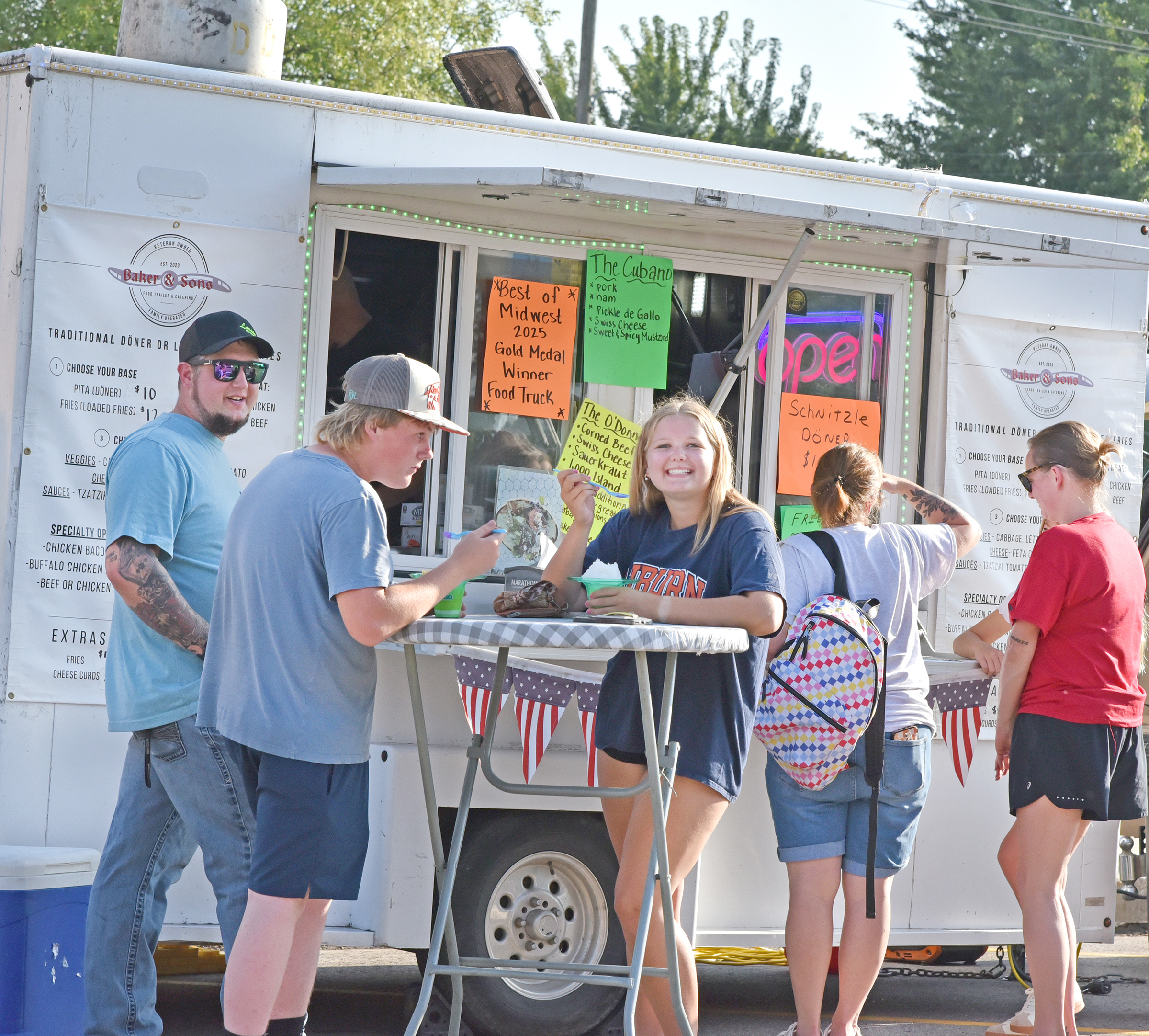 Tarkio Parks & Rec hosted a Final Taste of Summer Cruise Night Monday evening, August 18, 2025, on Main Street in Tarkio. Food trucks Baker and Sons, Fatbackzz Food Trailer, Cajun Country, Groovy’s Grub, and Tropical Sno Midwest were set up for locals and anyone cruising to stop and enjoy. The Flower Mill was also open late for cruisers to enjoy some shopping. Pictured above at Baker & Sons food truck are Seth McEnaney, Corbin Wallace, Bryna McEnaney, JoAnna Driskell, and Katie McEnaney.