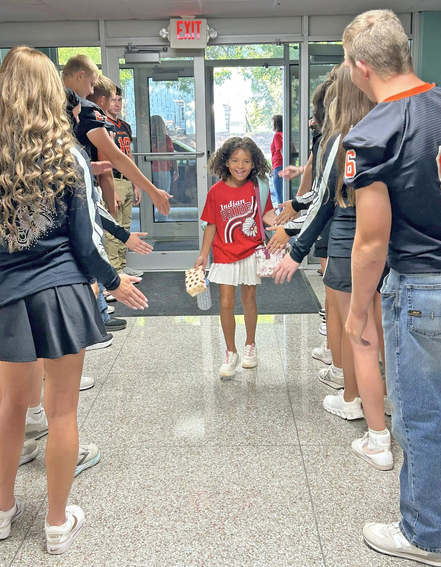 Gigi Vette is all smiles as she’s welcomed into the Tarkio Elementary building on the first day of school with high fives from East Atchison football players and cheerleaders. (East Atchison Boosters & More! Facebook photo)