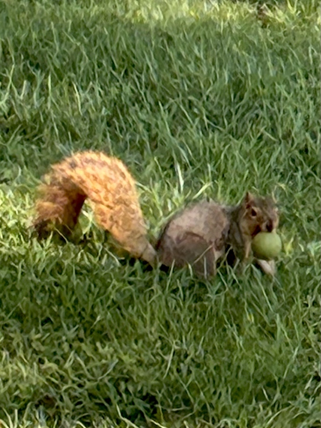 I rudely interrupted this Eastern Gray Squirrel’s mouthful of walnut dinner at the Rock Port park on a gorgeous Tuesday afternoon. He tolerated my presence and dutifully posed for a photo. We eyed one another a few more seconds before he skillfully scampered away with his prize. (by Cindy Walker Burton)